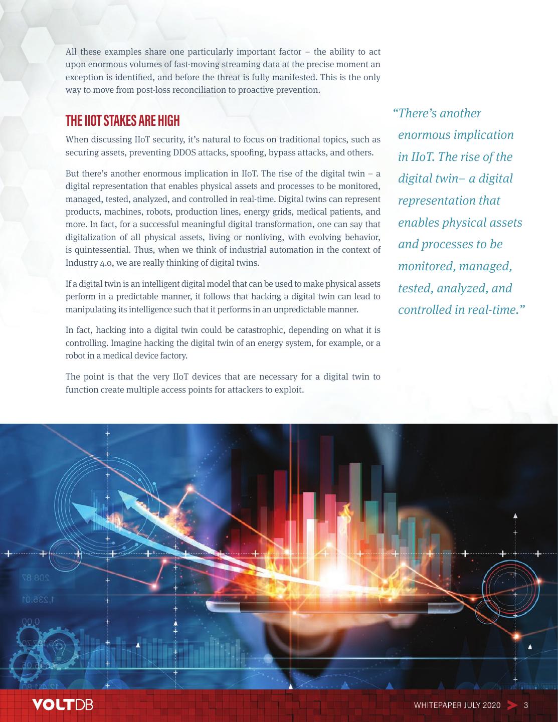 3 .All these examples share one particularly important factor – the ability to act upon enormous volumes of fast-moving streaming data at the precise moment an exception is identified, and before the threat is fully manifested. This is the only way to move from post-loss reconciliation to proactive prevention. “There’s another THE IIOT STAKES ARE HIGH When discussing IIoT security, it’s natural to focus on traditional topics, such as enormous implication securing assets, preventing DDOS attacks, spoofing, bypass attacks, and others. in IIoT. The rise of the But there’s another enormous implication in IIoT. The rise of the digital twin – a digital representation that enables physical assets and processes to be monitored, digital twin– a digital managed, tested, analyzed, and controlled in real-time. Digital twins can represent representation that products, machines, robots, production lines, energy grids, medical patients, and more. In fact, for a successful meaningful digital transformation, one can say that enables physical assets digitalization of all physical assets, living or nonliving, with evolving behavior, is quintessential. Thus, when we think of industrial automation in the context of and processes to be Industry 4.0, we are really thinking of digital twins. monitored, managed, If a digital twin is an intelligent digital model that can be used to make physical assets tested, analyzed, and perform in a predictable manner, it follows that hacking a digital twin can lead to manipulating its intelligence such that it performs in an unpredictable manner. controlled in real-time.” In fact, hacking into a digital twin could be catastrophic, depending on what it is controlling. Imagine hacking the digital twin of an energy system, for example, or a robot in a medical device factory. The point is that the very IIoT devices that are necessary for a digital twin to function create multiple access points for attackers to exploit. WHITEPAPER JULY 2020 3