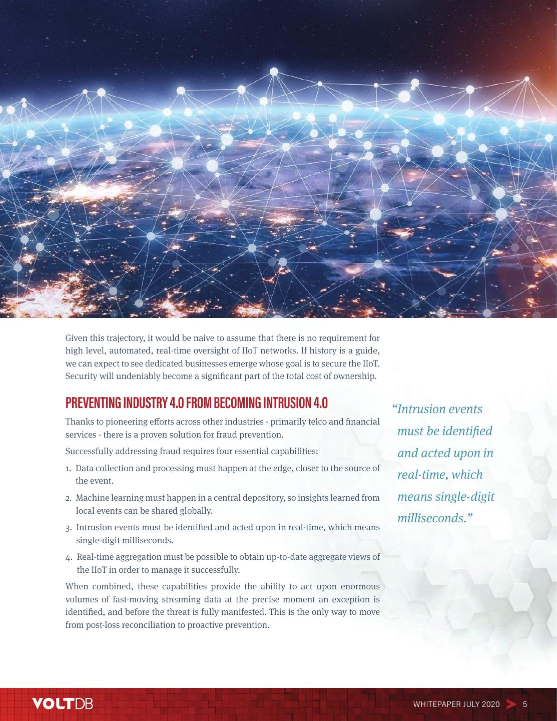5 .Given this trajectory, it would be naive to assume that there is no requirement for high level, automated, real-time oversight of IIoT networks. If history is a guide, we can expect to see dedicated businesses emerge whose goal is to secure the IIoT. Security will undeniably become a significant part of the total cost of ownership. PREVENTING INDUSTRY 4.0 FROM BECOMING INTRUSION 4.0 “Intrusion events Thanks to pioneering efforts across other industries - primarily telco and financial services - there is a proven solution for fraud prevention. must be identified Successfully addressing fraud requires four essential capabilities: and acted upon in 1. D ata collection and processing must happen at the edge, closer to the source of the event. real-time, which 2. M achine learning must happen in a central depository, so insights learned from means single-digit local events can be shared globally. milliseconds.” 3. I ntrusion events must be identified and acted upon in real-time, which means single-digit milliseconds. 4. R eal-time aggregation must be possible to obtain up-to-date aggregate views of the IIoT in order to manage it successfully. When combined, these capabilities provide the ability to act upon enormous volumes of fast-moving streaming data at the precise moment an exception is identified, and before the threat is fully manifested. This is the only way to move from post-loss reconciliation to proactive prevention. WHITEPAPER JULY 2020 5