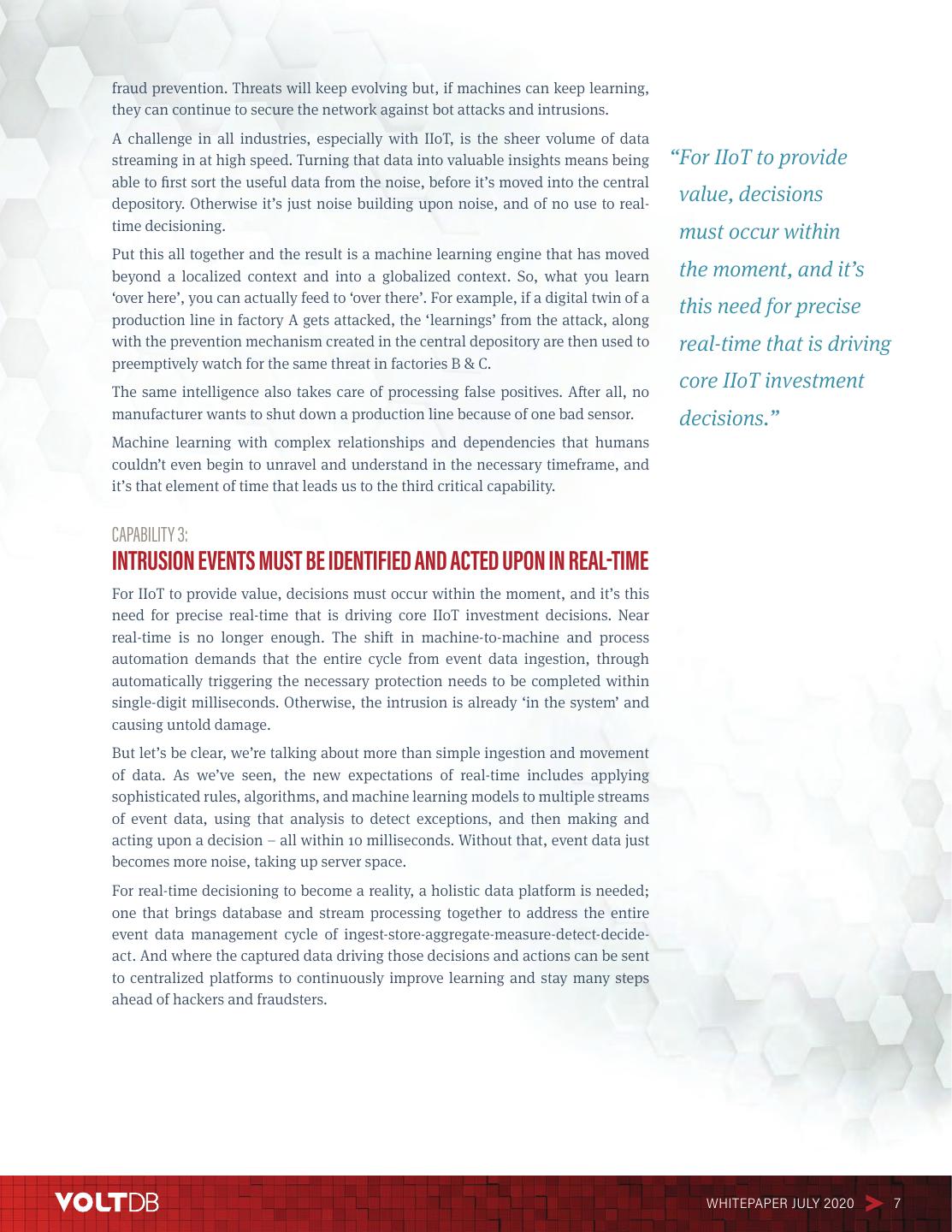 7 .fraud prevention. Threats will keep evolving but, if machines can keep learning, they can continue to secure the network against bot attacks and intrusions. A challenge in all industries, especially with IIoT, is the sheer volume of data streaming in at high speed. Turning that data into valuable insights means being “For IIoT to provide able to first sort the useful data from the noise, before it’s moved into the central depository. Otherwise it’s just noise building upon noise, and of no use to real- value, decisions time decisioning. must occur within Put this all together and the result is a machine learning engine that has moved beyond a localized context and into a globalized context. So, what you learn the moment, and it’s ‘over here’, you can actually feed to ‘over there’. For example, if a digital twin of a this need for precise production line in factory A gets attacked, the ‘learnings’ from the attack, along with the prevention mechanism created in the central depository are then used to real-time that is driving preemptively watch for the same threat in factories B & C. The same intelligence also takes care of processing false positives. After all, no core IIoT investment manufacturer wants to shut down a production line because of one bad sensor. decisions.” Machine learning with complex relationships and dependencies that humans couldn’t even begin to unravel and understand in the necessary timeframe, and it’s that element of time that leads us to the third critical capability. CAPABILITY 3: INTRUSION EVENTS MUST BE IDENTIFIED AND ACTED UPON IN REAL-TIME For IIoT to provide value, decisions must occur within the moment, and it’s this need for precise real-time that is driving core IIoT investment decisions. Near real-time is no longer enough. The shift in machine-to-machine and process automation demands that the entire cycle from event data ingestion, through automatically triggering the necessary protection needs to be completed within single-digit milliseconds. Otherwise, the intrusion is already ‘in the system’ and causing untold damage. But let’s be clear, we’re talking about more than simple ingestion and movement of data. As we’ve seen, the new expectations of real-time includes applying sophisticated rules, algorithms, and machine learning models to multiple streams of event data, using that analysis to detect exceptions, and then making and acting upon a decision – all within 10 milliseconds. Without that, event data just becomes more noise, taking up server space. For real-time decisioning to become a reality, a holistic data platform is needed; one that brings database and stream processing together to address the entire event data management cycle of ingest-store-aggregate-measure-detect-decide- act. And where the captured data driving those decisions and actions can be sent to centralized platforms to continuously improve learning and stay many steps ahead of hackers and fraudsters. WHITEPAPER JULY 2020 7