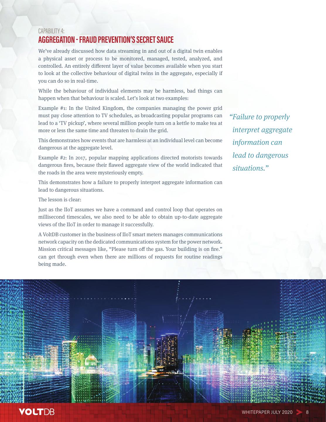 8 .CAPABILITY 4: AGGREGATION - FRAUD PREVENTION’S SECRET SAUCE We’ve already discussed how data streaming in and out of a digital twin enables a physical asset or process to be monitored, managed, tested, analyzed, and controlled. An entirely different layer of value becomes available when you start to look at the collective behaviour of digital twins in the aggregate, especially if you can do so in real-time. While the behaviour of individual elements may be harmless, bad things can happen when that behaviour is scaled. Let’s look at two examples: Example #1: In the United Kingdom, the companies managing the power grid must pay close attention to TV schedules, as broadcasting popular programs can “Failure to properly lead to a ‘TV pickup’, where several million people turn on a kettle to make tea at more or less the same time and threaten to drain the grid. interpret aggregate This demonstrates how events that are harmless at an individual level can become information can dangerous at the aggregate level. Example #2: In 2017, popular mapping applications directed motorists towards lead to dangerous dangerous fires, because their flawed aggregate view of the world indicated that situations.” the roads in the area were mysteriously empty. This demonstrates how a failure to properly interpret aggregate information can lead to dangerous situations. The lesson is clear: Just as the IIoT assumes we have a command and control loop that operates on millisecond timescales, we also need to be able to obtain up-to-date aggregate views of the IIoT in order to manage it successfully. A VoltDB customer in the business of IIoT smart meters manages communications network capacity on the dedicated communications system for the power network. Mission critical messages like, “Please turn off the gas. Your building is on fire.” can get through even when there are millions of requests for routine readings being made. WHITEPAPER JULY 2020 8