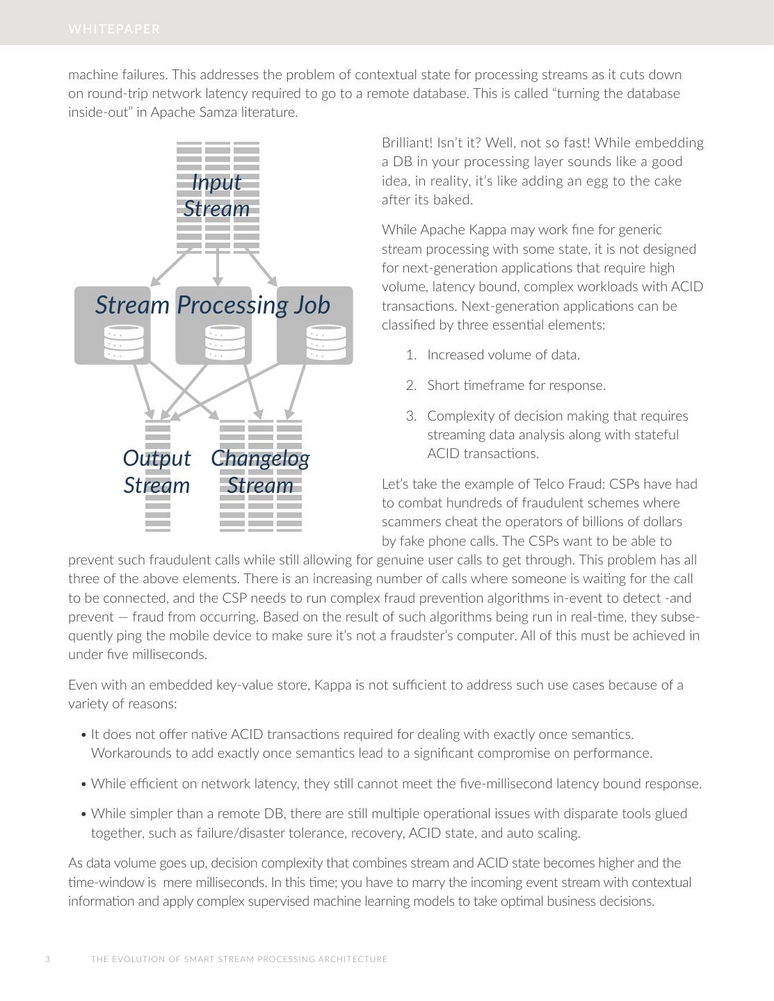 3 . WHITEPAPER machine failures. This addresses the problem of contextual state for processing streams as it cuts down on round-trip network latency required to go to a remote database. This is called “turning the database inside-out” in Apache Samza literature. Brilliant! Isn’t it? Well, not so fast! While embedding a DB in your processing layer sounds like a good Input idea, in reality, it’s like adding an egg to the cake after its baked. Stream While Apache Kappa may work fine for generic stream processing with some state, it is not designed for next-generation applications that require high volume, latency bound, complex workloads with ACID Stream Processing Job transactions. Next-generation applications can be classified by three essential elements: 1. Increased volume of data. 2. Short timeframe for response. 3. Complexity of decision making that requires streaming data analysis along with stateful Output Changelog ACID transactions. Stream Stream Let’s take the example of Telco Fraud: CSPs have had to combat hundreds of fraudulent schemes where scammers cheat the operators of billions of dollars by fake phone calls. The CSPs want to be able to prevent such fraudulent calls while still allowing for genuine user calls to get through. This problem has all three of the above elements. There is an increasing number of calls where someone is waiting for the call to be connected, and the CSP needs to run complex fraud prevention algorithms in-event to detect -and prevent — fraud from occurring. Based on the result of such algorithms being run in real-time, they subse- quently ping the mobile device to make sure it’s not a fraudster’s computer. All of this must be achieved in under five milliseconds. Even with an embedded key-value store, Kappa is not sufficient to address such use cases because of a variety of reasons: • It does not offer native ACID transactions required for dealing with exactly once semantics. Workarounds to add exactly once semantics lead to a significant compromise on performance. • While efficient on network latency, they still cannot meet the five-millisecond latency bound response. • While simpler than a remote DB, there are still multiple operational issues with disparate tools glued together, such as failure/disaster tolerance, recovery, ACID state, and auto scaling. As data volume goes up, decision complexity that combines stream and ACID state becomes higher and the time-window is mere milliseconds. In this time; you have to marry the incoming event stream with contextual information and apply complex supervised machine learning models to take optimal business decisions. 3 T H E E VO LU T I O N O F S M A RT S T REA M P RO C ES S I N G A RCHITECTUR E