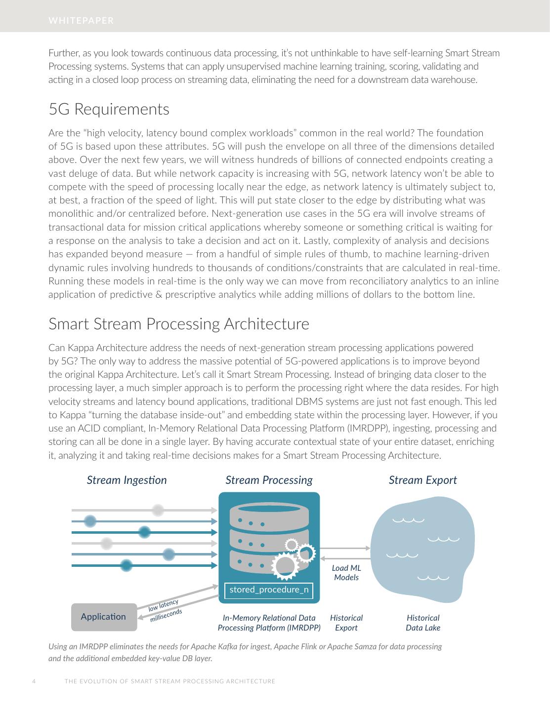 1 .WHITEPAPER The Evolution of Smart Stream Processing Architecture Enhancing the Kappa Architecture for Stateful Streams Background Real world streaming use cases are pushing the boundaries of traditional data analytics. Up until now, the shift from bounded to unbounded was occurring at a much slower pace. 5G, however, is promising to revolutionize the connectivity of not just people but also things such as industrial machinery, residential appliances, medical devices, utility meters and more. By the year 2021, Gartner estimates that a total of 25.1 billion edge devices will be installed worldwide. With sub-millisecond latency guarantees and over 1MM devices/km2 stipulated in the 5G standard, companies are being forced to operate in a hyper-connected world. The capabilities of 5G will enable a new set of real-time applications that will now leverage the low latency ubiquitous networking to create many new use cases around Industrial & Medical IoT, AR/VR, immersive gaming and more. All this will put a massive load on traditional data management architectures. The primary reason for the break in existing architecture patterns stems from the fact that we are moving from managing and analyzing bounded data sets, to processing and making decisions on unbounded data streams. Typically, bound data has a known ending point and is relatively fixed. An example of bounded data would be subscriber account data at a Communications Service Provider (CSP). Analyzing and acting on bounded datasets is relatively easy. Traditional relational databases can solve most bounded data problems. On the other hand, unbound data is infinite and not always sequential. For example, monitoring temperature and pressure at various points in a manufac- turing facility is unbounded data. This data is constantly being generated and must be analyzed in real-time for predictive maintenance. As we move from bounded to unbounded data problems, Smart Stream Processing can be broadly considered as a continuous data processing system. This requires the ability to intelligently analyze the data streams on the fly, draw meaningful insights and take actions continuously, eliminating the need to store and subsequently query the data in a downstream serving database.