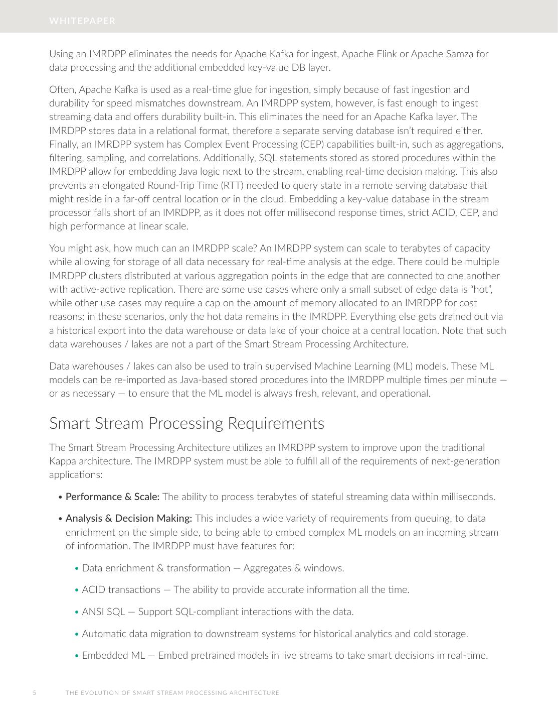 5 . WHITEPAPER Using an IMRDPP eliminates the needs for Apache Kafka for ingest, Apache Flink or Apache Samza for data processing and the additional embedded key-value DB layer. Often, Apache Kafka is used as a real-time glue for ingestion, simply because of fast ingestion and durability for speed mismatches downstream. An IMRDPP system, however, is fast enough to ingest streaming data and offers durability built-in. This eliminates the need for an Apache Kafka layer. The IMRDPP stores data in a relational format, therefore a separate serving database isn’t required either. Finally, an IMRDPP system has Complex Event Processing (CEP) capabilities built-in, such as aggregations, filtering, sampling, and correlations. Additionally, SQL statements stored as stored procedures within the IMRDPP allow for embedding Java logic next to the stream, enabling real-time decision making. This also prevents an elongated Round-Trip Time (RTT) needed to query state in a remote serving database that might reside in a far-off central location or in the cloud. Embedding a key-value database in the stream processor falls short of an IMRDPP, as it does not offer millisecond response times, strict ACID, CEP, and high performance at linear scale. You might ask, how much can an IMRDPP scale? An IMRDPP system can scale to terabytes of capacity while allowing for storage of all data necessary for real-time analysis at the edge. There could be multiple IMRDPP clusters distributed at various aggregation points in the edge that are connected to one another with active-active replication. There are some use cases where only a small subset of edge data is “hot”, while other use cases may require a cap on the amount of memory allocated to an IMRDPP for cost reasons; in these scenarios, only the hot data remains in the IMRDPP. Everything else gets drained out via a historical export into the data warehouse or data lake of your choice at a central location. Note that such data warehouses / lakes are not a part of the Smart Stream Processing Architecture. Data warehouses / lakes can also be used to train supervised Machine Learning (ML) models. These ML models can be re-imported as Java-based stored procedures into the IMRDPP multiple times per minute — or as necessary — to ensure that the ML model is always fresh, relevant, and operational. Smart Stream Processing Requirements The Smart Stream Processing Architecture utilizes an IMRDPP system to improve upon the traditional Kappa architecture. The IMRDPP system must be able to fulfill all of the requirements of next-generation applications: • Performance & Scale: The ability to process terabytes of stateful streaming data within milliseconds. • Analysis & Decision Making: This includes a wide variety of requirements from queuing, to data enrichment on the simple side, to being able to embed complex ML models on an incoming stream of information. The IMRDPP must have features for: • Data enrichment & transformation — Aggregates & windows. • ACID transactions — The ability to provide accurate information all the time. • ANSI SQL — Support SQL-compliant interactions with the data. • Automatic data migration to downstream systems for historical analytics and cold storage. • Embedded ML — Embed pretrained models in live streams to take smart decisions in real-time. 5 T H E E VO LU T I O N O F S M A RT S T REA M P RO C ES S I N G A RCHITECTUR E