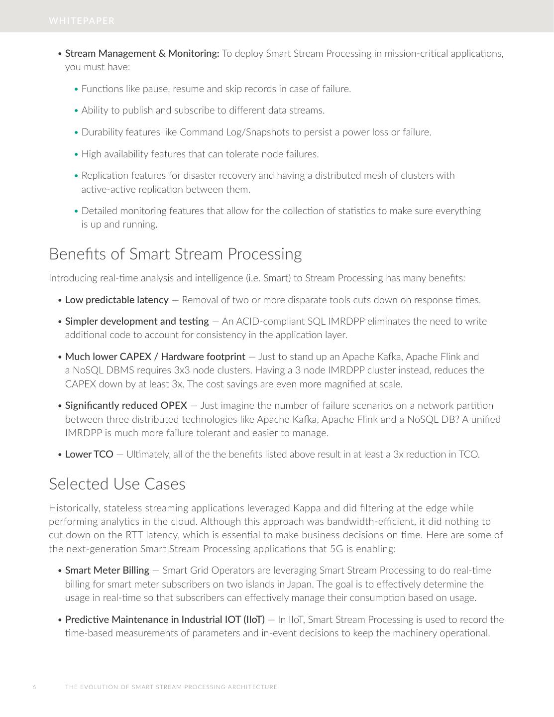 6 . WHITEPAPER • Stream Management & Monitoring: To deploy Smart Stream Processing in mission-critical applications, you must have: • Functions like pause, resume and skip records in case of failure. • Ability to publish and subscribe to different data streams. • Durability features like Command Log/Snapshots to persist a power loss or failure. • High availability features that can tolerate node failures. • Replication features for disaster recovery and having a distributed mesh of clusters with active-active replication between them. • Detailed monitoring features that allow for the collection of statistics to make sure everything is up and running. Benefits of Smart Stream Processing Introducing real-time analysis and intelligence (i.e. Smart) to Stream Processing has many benefits: • Low predictable latency — Removal of two or more disparate tools cuts down on response times. • Simpler development and testing — An ACID-compliant SQL IMRDPP eliminates the need to write additional code to account for consistency in the application layer. • Much lower CAPEX / Hardware footprint — Just to stand up an Apache Kafka, Apache Flink and a NoSQL DBMS requires 3x3 node clusters. Having a 3 node IMRDPP cluster instead, reduces the CAPEX down by at least 3x. The cost savings are even more magnified at scale. • Significantly reduced OPEX — Just imagine the number of failure scenarios on a network partition between three distributed technologies like Apache Kafka, Apache Flink and a NoSQL DB? A unified IMRDPP is much more failure tolerant and easier to manage. • Lower TCO — Ultimately, all of the the benefits listed above result in at least a 3x reduction in TCO. Selected Use Cases Historically, stateless streaming applications leveraged Kappa and did filtering at the edge while performing analytics in the cloud. Although this approach was bandwidth-efficient, it did nothing to cut down on the RTT latency, which is essential to make business decisions on time. Here are some of the next-generation Smart Stream Processing applications that 5G is enabling: • Smart Meter Billing — Smart Grid Operators are leveraging Smart Stream Processing to do real-time billing for smart meter subscribers on two islands in Japan. The goal is to effectively determine the usage in real-time so that subscribers can effectively manage their consumption based on usage. • Predictive Maintenance in Industrial IOT (IIoT) — In IIoT, Smart Stream Processing is used to record the time-based measurements of parameters and in-event decisions to keep the machinery operational. 6 T H E E VO LU T I O N O F S M A RT S T REA M P RO C ES S I N G A RCHITECTUR E
