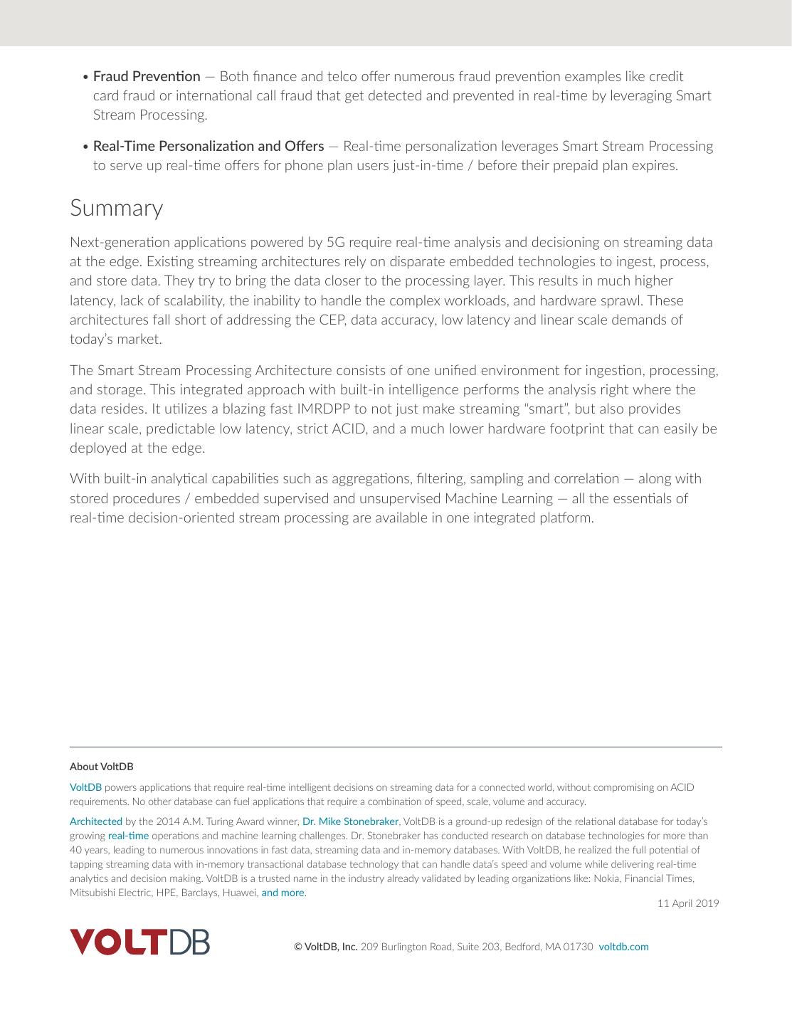 7 . • Fraud Prevention — Both finance and telco offer numerous fraud prevention examples like credit card fraud or international call fraud that get detected and prevented in real-time by leveraging Smart Stream Processing. • Real-Time Personalization and Offers — Real-time personalization leverages Smart Stream Processing to serve up real-time offers for phone plan users just-in-time / before their prepaid plan expires. Summary Next-generation applications powered by 5G require real-time analysis and decisioning on streaming data at the edge. Existing streaming architectures rely on disparate embedded technologies to ingest, process, and store data. They try to bring the data closer to the processing layer. This results in much higher latency, lack of scalability, the inability to handle the complex workloads, and hardware sprawl. These architectures fall short of addressing the CEP, data accuracy, low latency and linear scale demands of today’s market. The Smart Stream Processing Architecture consists of one unified environment for ingestion, processing, and storage. This integrated approach with built-in intelligence performs the analysis right where the data resides. It utilizes a blazing fast IMRDPP to not just make streaming “smart”, but also provides linear scale, predictable low latency, strict ACID, and a much lower hardware footprint that can easily be deployed at the edge. With built-in analytical capabilities such as aggregations, filtering, sampling and correlation — along with stored procedures / embedded supervised and unsupervised Machine Learning — all the essentials of real-time decision-oriented stream processing are available in one integrated platform. About VoltDB VoltDB powers applications that require real-time intelligent decisions on streaming data for a connected world, without compromising on ACID requirements. No other database can fuel applications that require a combination of speed, scale, volume and accuracy. Architected by the 2014 A.M. Turing Award winner, Dr. Mike Stonebraker, VoltDB is a ground-up redesign of the relational database for today’s growing real-time operations and machine learning challenges. Dr. Stonebraker has conducted research on database technologies for more than 40 years, leading to numerous innovations in fast data, streaming data and in-memory databases. With VoltDB, he realized the full potential of tapping streaming data with in-memory transactional database technology that can handle data’s speed and volume while delivering real-time analytics and decision making. VoltDB is a trusted name in the industry already validated by leading organizations like: Nokia, Financial Times, Mitsubishi Electric, HPE, Barclays, Huawei, and more. 11 April 2019 © VoltDB, Inc. 209 Burlington Road, Suite 203, Bedford, MA 01730 voltdb.com