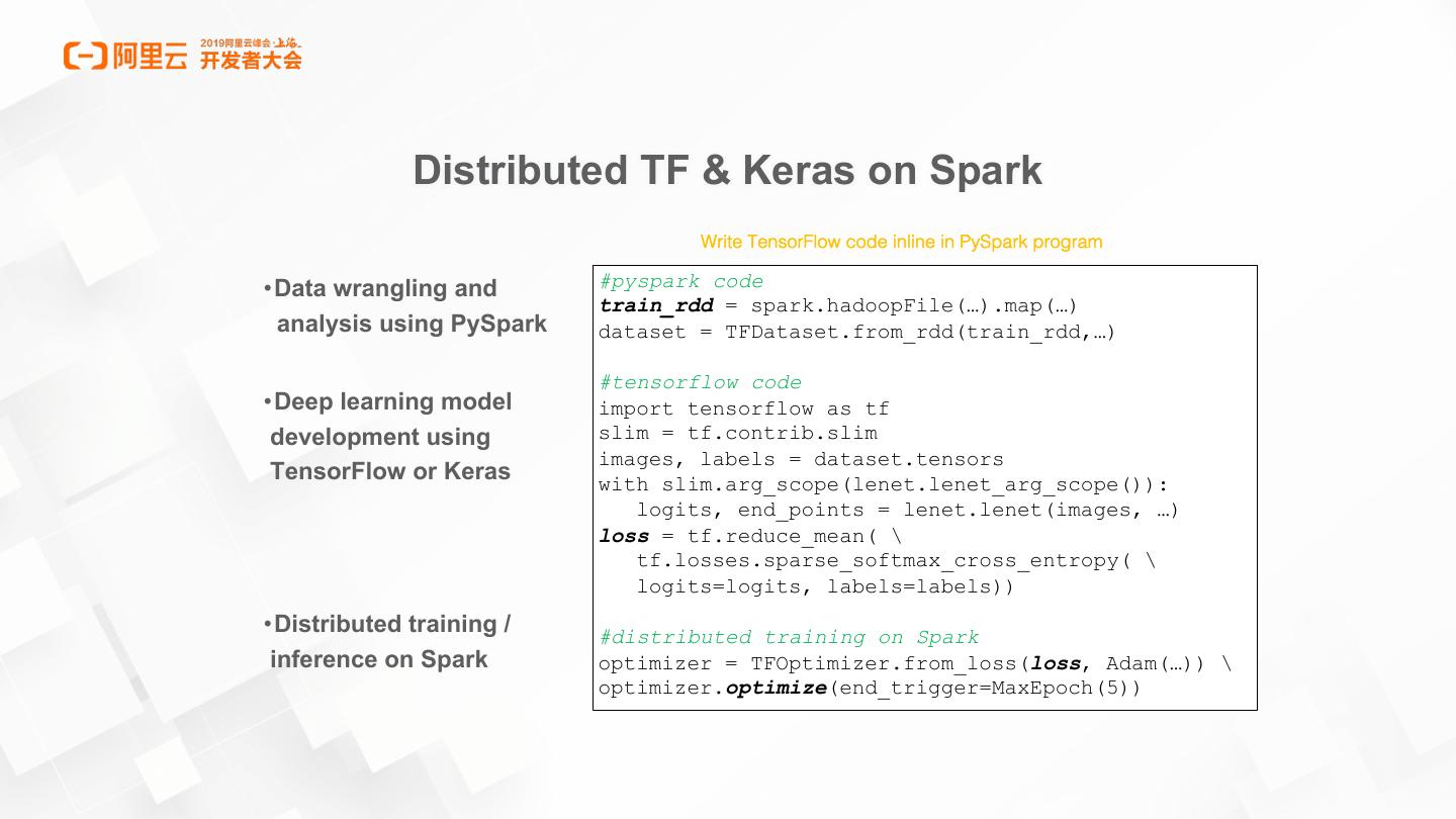 8 .Standard Spark jobs • No changes to the Spark or Hadoop clusters needed Data parallel • Each Spark task runs the same model on a subset of the data (batch) “Zero” code change • Directly support TensorFlow, Keras and Caffe Model Seamlessly deployed on production big data clusters • Only need to install on driver node.