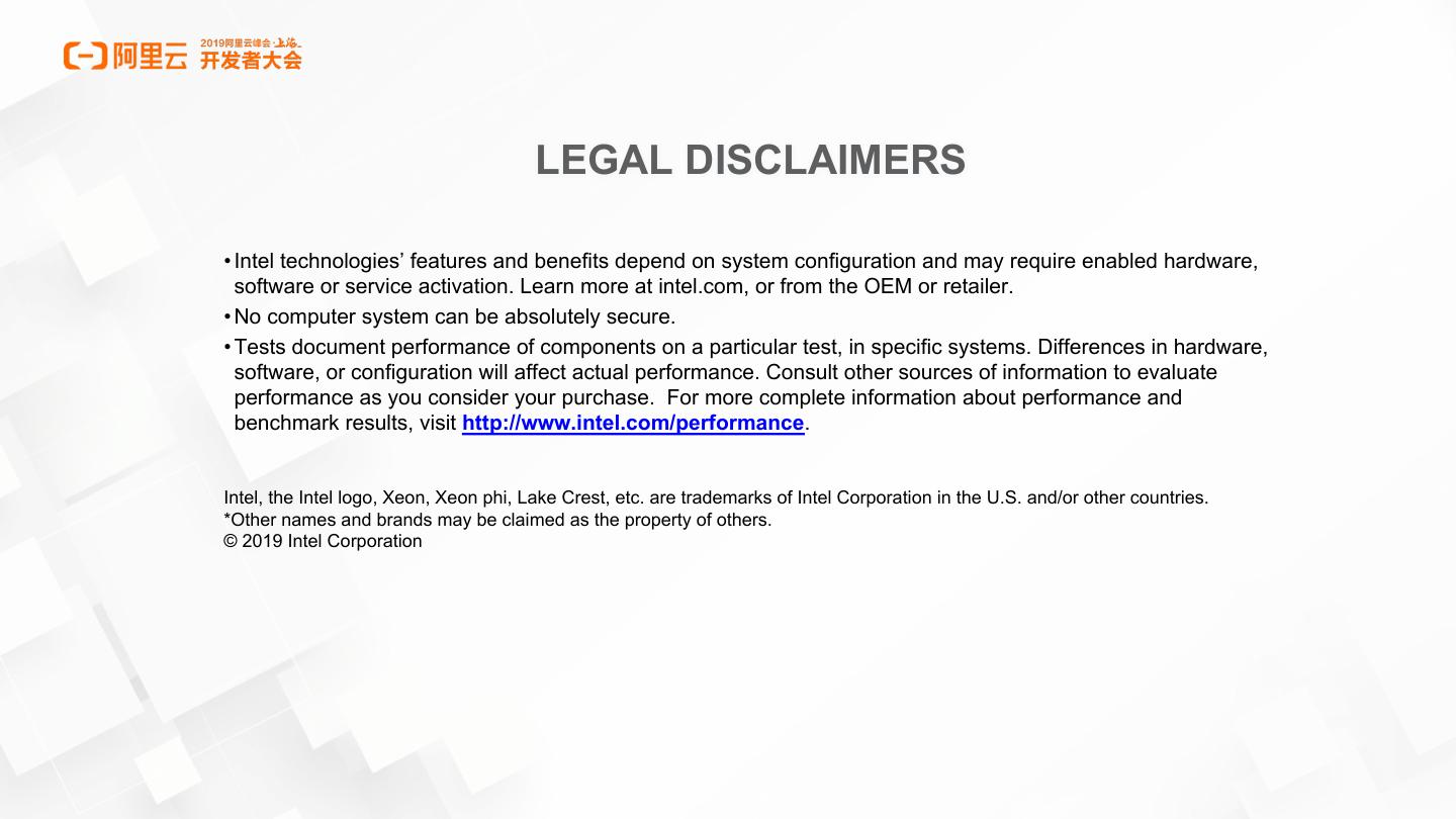 22 . LEGAL DISCLAIMERS • Intel technologies’ features and benefits depend on system configuration and may require enabled hardware, software or service activation. Learn more at intel.com, or from the OEM or retailer. • No computer system can be absolutely secure. • Tests document performance of components on a particular test, in specific systems. Differences in hardware, software, or configuration will affect actual performance. Consult other sources of information to evaluate performance as you consider your purchase. For more complete information about performance and benchmark results, visit http://www.intel.com/performance. Intel, the Intel logo, Xeon, Xeon phi, Lake Crest, etc. are trademarks of Intel Corporation in the U.S. and/or other countries. *Other names and brands may be claimed as the property of others. © 2019 Intel Corporation