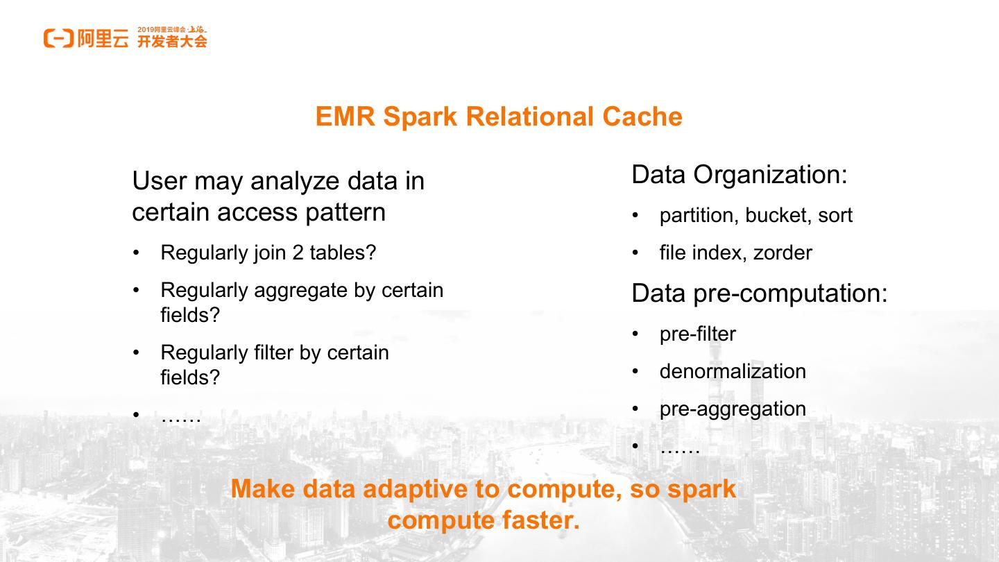 8 . EMR Spark Relational Cache User may analyze data in Data Organization: certain access pattern • partition, bucket, sort • Regularly join 2 tables? • file index, zorder • Regularly aggregate by certain Data pre-computation: fields? • pre-filter • Regularly filter by certain fields? • denormalization • …… • pre-aggregation • …… Make data adaptive to compute, so spark compute faster.
