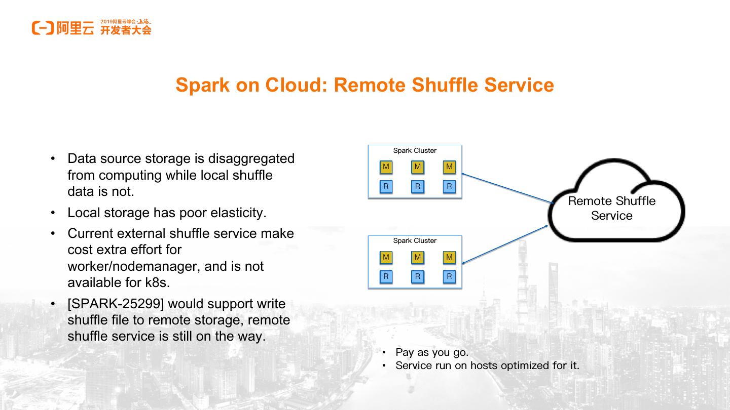 13 . Spark on Cloud: Remote Shuffle Service • Data source storage is disaggregated M M M from computing while local shuffle R R R data is not. • Local storage has poor elasticity. • Current external shuffle service make cost extra effort for M M M worker/nodemanager, and is not R R R available for k8s. • [SPARK-25299] would support write shuffle file to remote storage, remote shuffle service is still on the way. • •