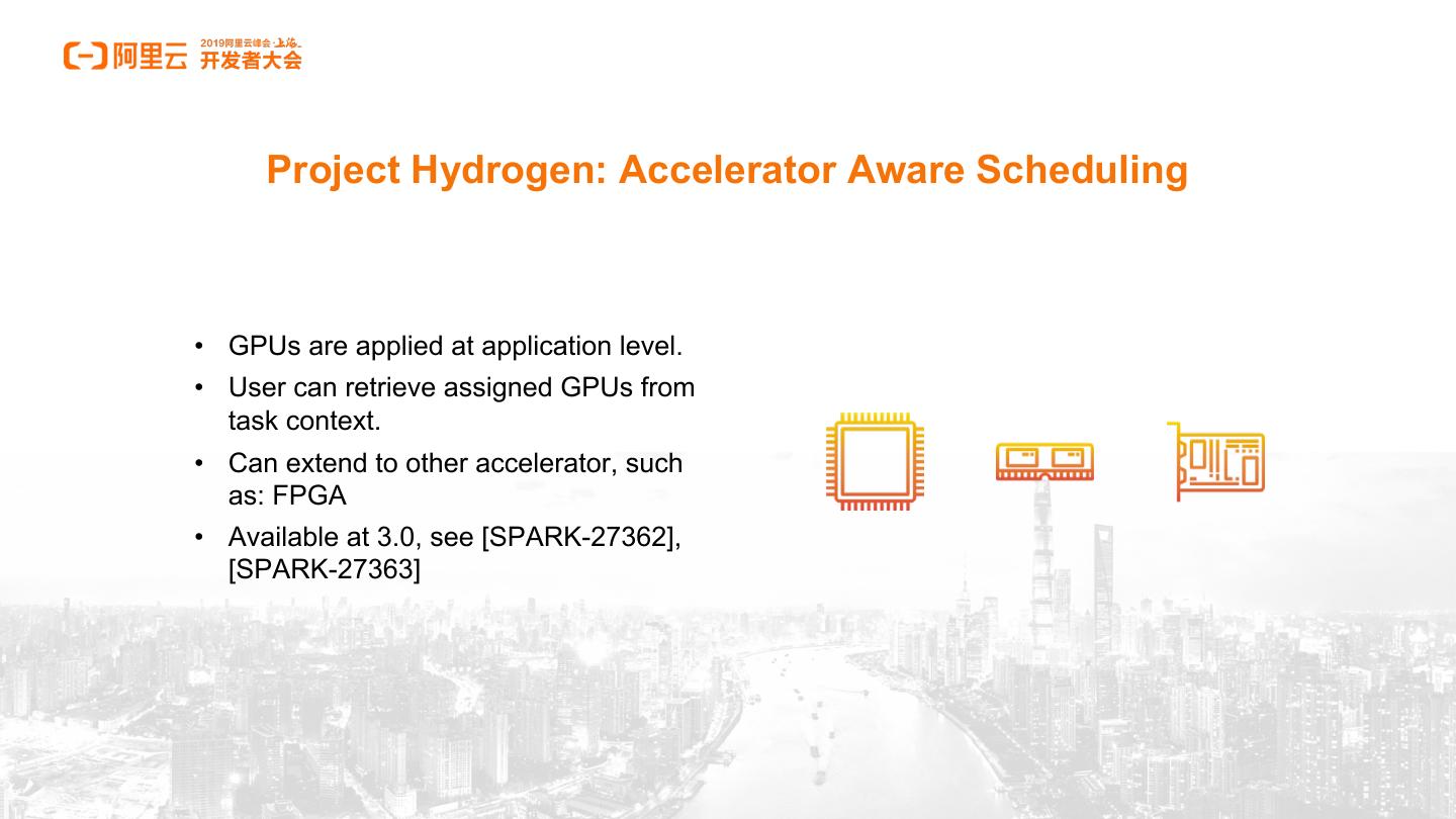 18 . Project Hydrogen: Accelerator Aware Scheduling • GPUs are applied at application level. • User can retrieve assigned GPUs from task context. • Can extend to other accelerator, such as: FPGA • Available at 3.0, see [SPARK-27362], [SPARK-27363]