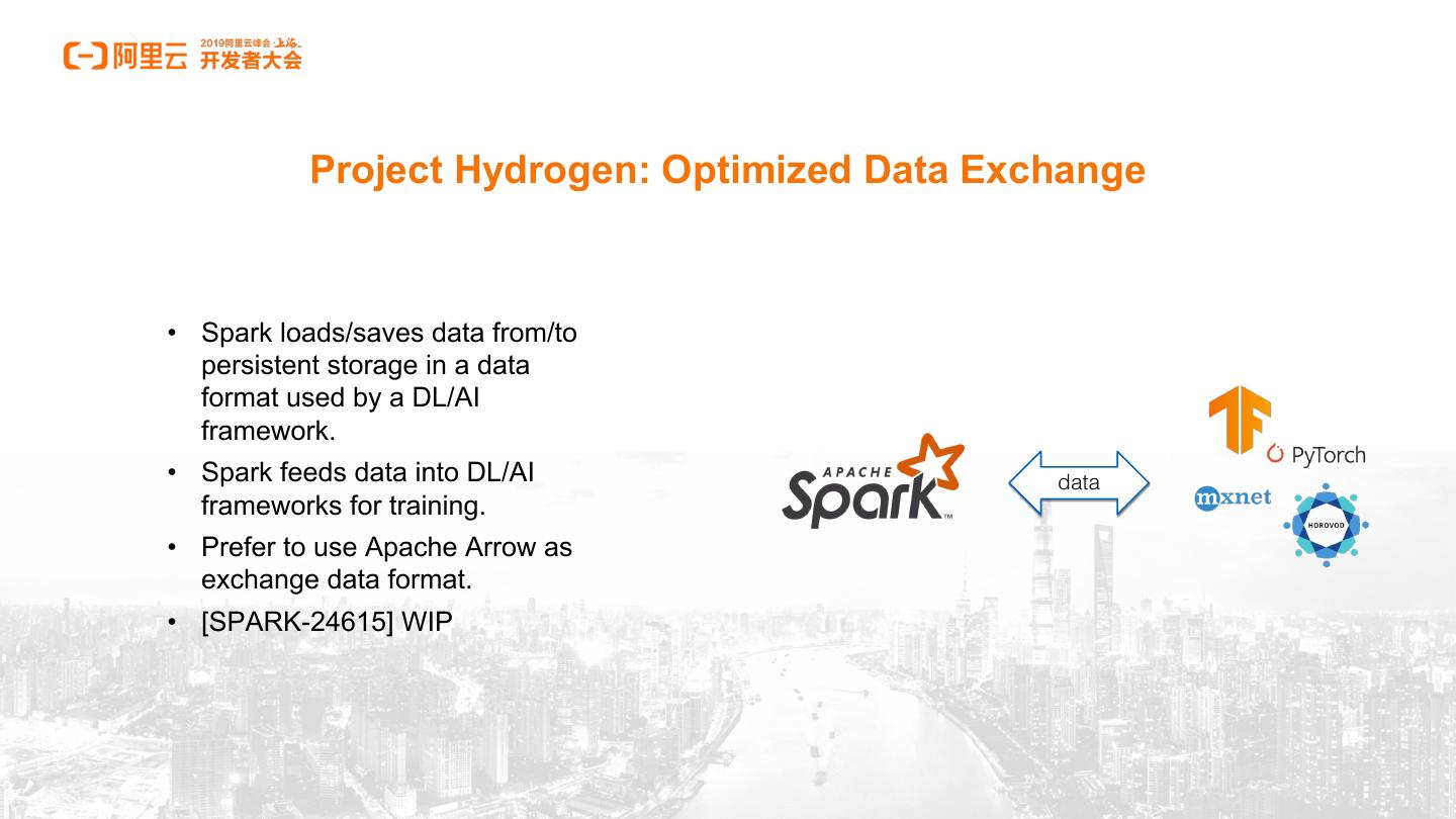 19 . Project Hydrogen: Optimized Data Exchange • Spark loads/saves data from/to persistent storage in a data format used by a DL/AI framework. • Spark feeds data into DL/AI data frameworks for training. • Prefer to use Apache Arrow as exchange data format. • [SPARK-24615] WIP