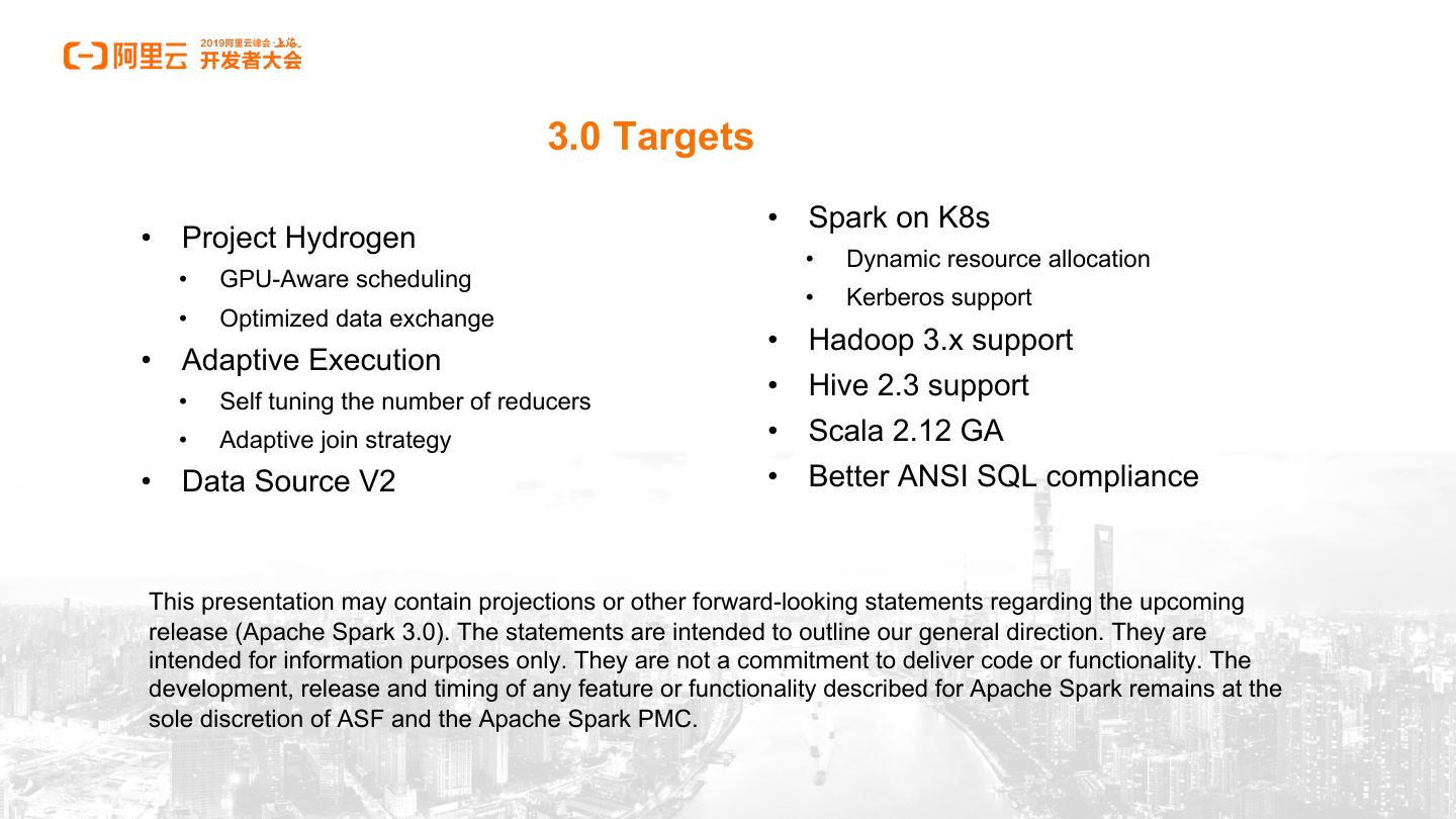 21 . 3.0 Targets • Spark on K8s • Project Hydrogen • Dynamic resource allocation • GPU-Aware scheduling • Kerberos support • Optimized data exchange • Hadoop 3.x support • Adaptive Execution • Self tuning the number of reducers • Hive 2.3 support • Adaptive join strategy • Scala 2.12 GA • Data Source V2 • Better ANSI SQL compliance This presentation may contain projections or other forward-looking statements regarding the upcoming release (Apache Spark 3.0). The statements are intended to outline our general direction. They are intended for information purposes only. They are not a commitment to deliver code or functionality. The development, release and timing of any feature or functionality described for Apache Spark remains at the sole discretion of ASF and the Apache Spark PMC.