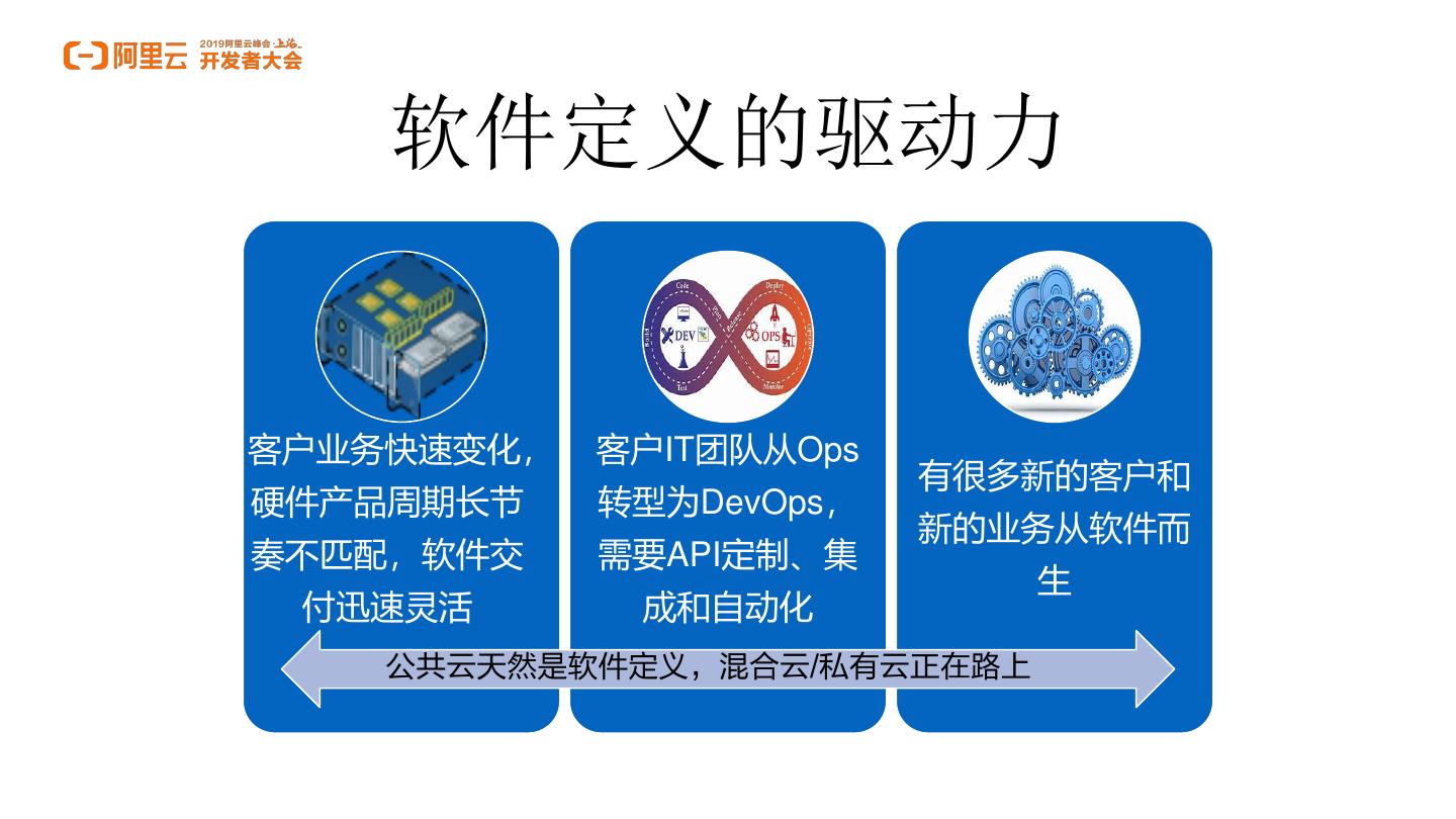 3 . 软件定义的驱动力 客户业务快速变化, 客户IT团队从Ops 有很多新的客户和 硬件产品周期长节 转型为DevOps, 新的业务从软件而 奏不匹配,软件交 需要API定制、集 生 付迅速灵活 成和自动化 公共云天然是软件定义,混合云/私有云正在路上
