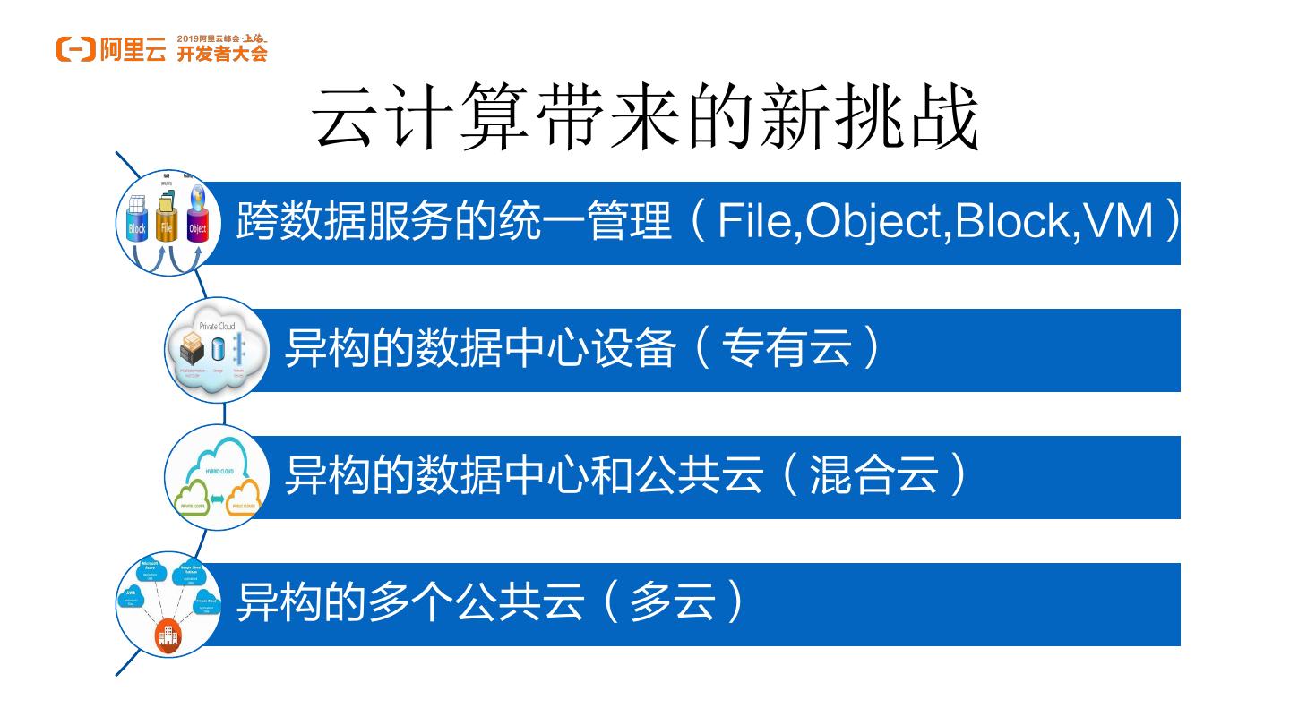 4 . 云计算带来的新挑战 跨数据服务的统一管理(File,Object,Block,VM) 异构的数据中心设备(专有云) 异构的数据中心和公共云(混合云) 异构的多个公共云(多云)