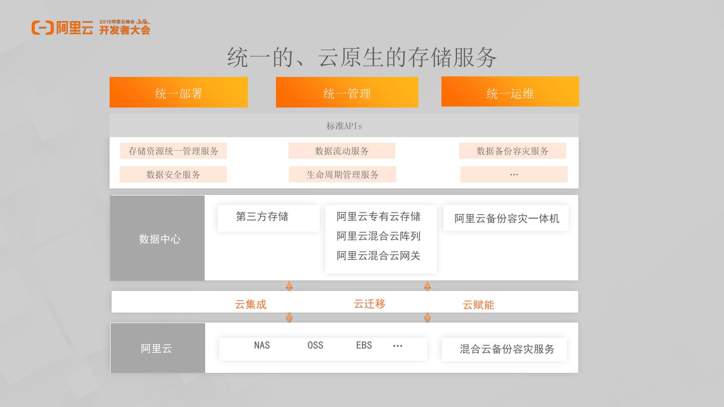 6 . 统一的、云原生的存储服务 统一部署 统一管理 统一运维 标准APIs 存储资源统一管理服务 数据流动服务 数据备份容灾服务 公共云存储 数据安全服务 生命周期管理服务 … 存储服务 第三方存储 阿里云专有云存储 阿里云备份容灾一体机 数据中心 阿里云混合云阵列 阿里云混合云网关 云集成 云迁移 云赋能 公共云存储服务 阿里云 NAS OSS EBS … 混合云备份容灾服务