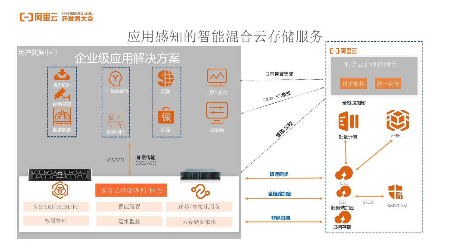 8 . 应用感知的智能混合云存储服务 用户数据中心 企业级应用解决方案 混合云存储控制台 日志告警集成 备份归档 日志监控 统一管控 AI/基因测序 金融 运维监控 视频监控 全链路加密 医学影像 保险 控制台 影视制作 批量计算 EHPC 加密传输 NAS/SAN (DES/AES) 极速同步 OSS 混合云存储阵列/网关 全链路加密 文件读写 双向增量 公共云存储 极速同步 OSS BYOK NFS/SMB/iSCSI/FC 智能缓存 迁移/虚拟化服务 KMS/HSM 秒级发现智能归档/解冻 服务端加密 文件操作 OSS 智能归档 智能归档 权限管理 运维监控 云存储虚拟化 归档存储