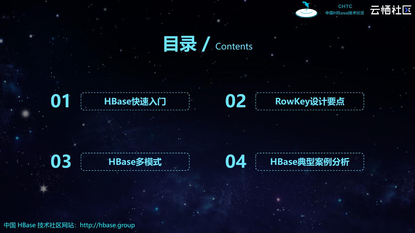 2 . 目录 / Contents 01 HBase快速入门 02 RowKey设计要点 03 HBase多模式 04 HBase典型案例分析 中国 HBase 技术社区网站:http://hbase.group