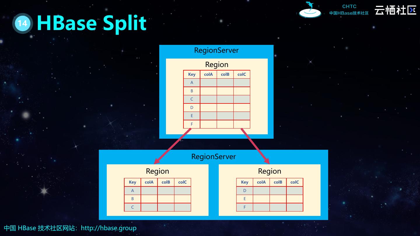 17 . 14 HBase Split RegionServer Region Key colA colB colC A B C D E F RegionServer Region Region Key colA colB colC Key colA colB colC A D B E C F 中国 HBase 技术社区网站:http://hbase.group