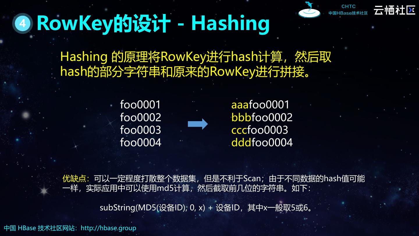 24 . 4 RowKey的设计 - Hashing Hashing 的原理将RowKey进行hash计算,然后取 hash的部分字符串和原来的RowKey进行拼接。 foo0001 aaafoo0001 foo0002 bbbfoo0002 foo0003 cccfoo0003 foo0004 dddfoo0004 优缺点:可以一定程度打散整个数据集,但是不利于Scan;由于不同数据的hash值可能 一样,实际应用中可以使用md5计算,然后截取前几位的字符串。如下: subString(MD5(设备ID), 0, x) + 设备ID,其中x一般取5或6。 中国 HBase 技术社区网站:http://hbase.group