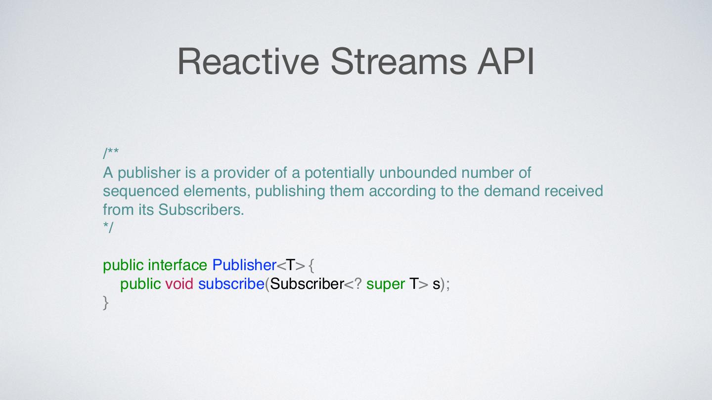 15 . Reactive Streams API /** Will receive calls to Subscriber.onSubscribe(Subscription) once after passing an instance of Subscriber to Publisher.subscribe(Subscriber). */ public interface Subscriber<T> { public void onSubscribe(Subscription s); public void onNext(T t); public void onError(Throwable t); public void onComplete(); }