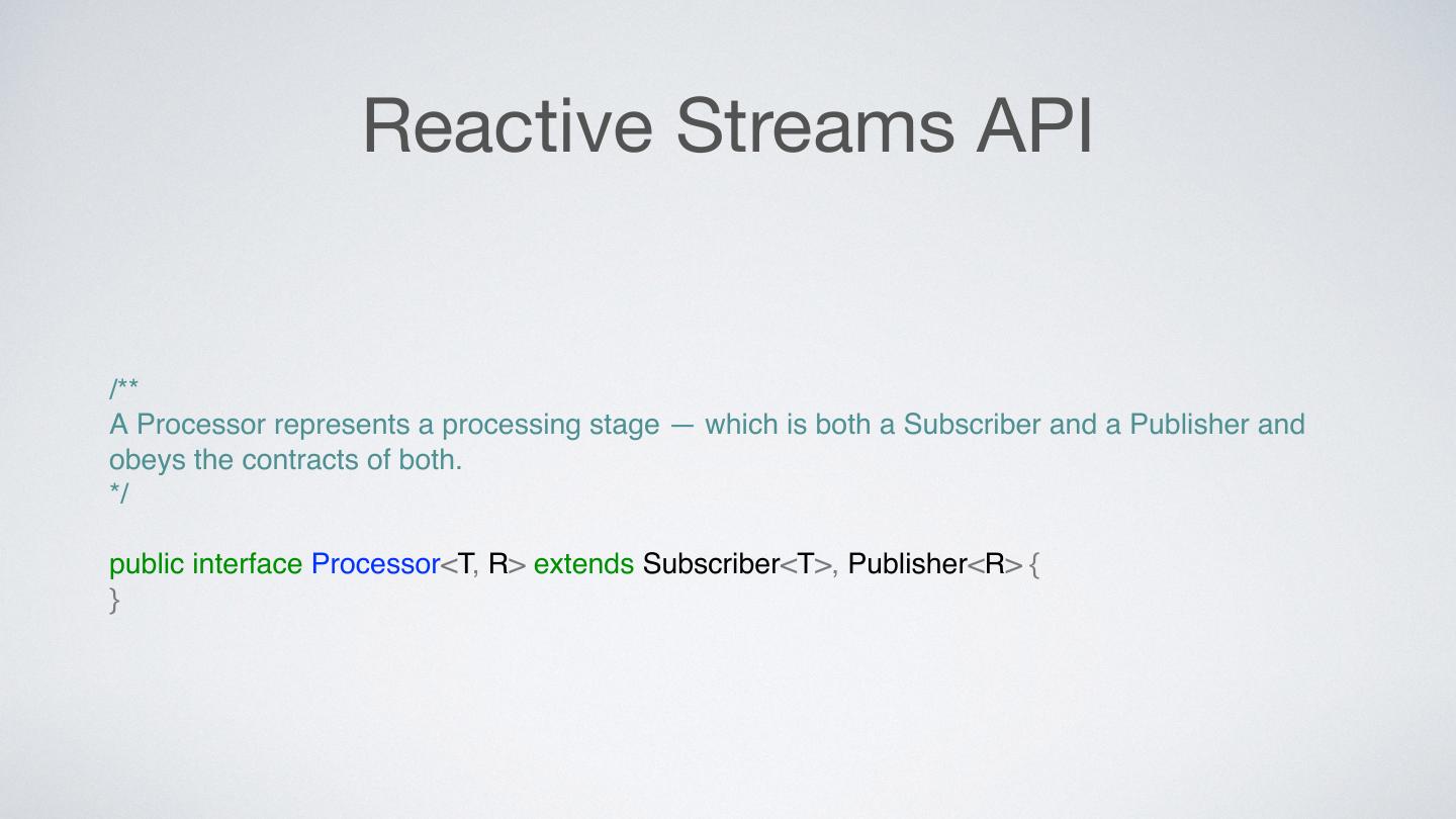 17 . Reactive Streams API /** A Processor represents a processing stage — which is both a Subscriber and a Publisher and obeys the contracts of both. */ public interface Processor<T, R> extends Subscriber<T>, Publisher<R> { }