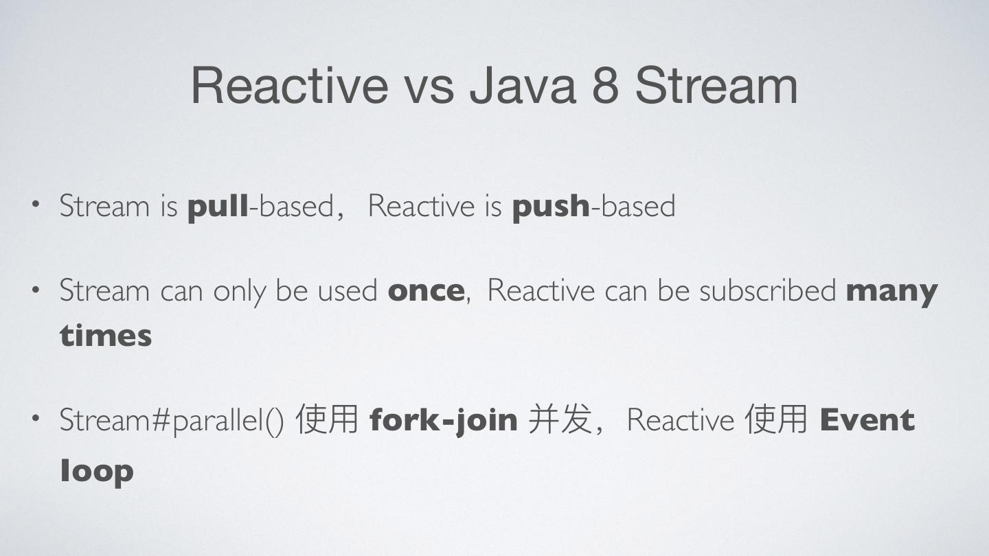 23 . Reactive vs Java 8 Stream • Stream is pull-based,Reactive is push-based • Stream can only be used once, Reactive can be subscribed many times • Stream#parallel() 使⽤用 fork-join 并发,Reactive 使⽤用 Event Ioop