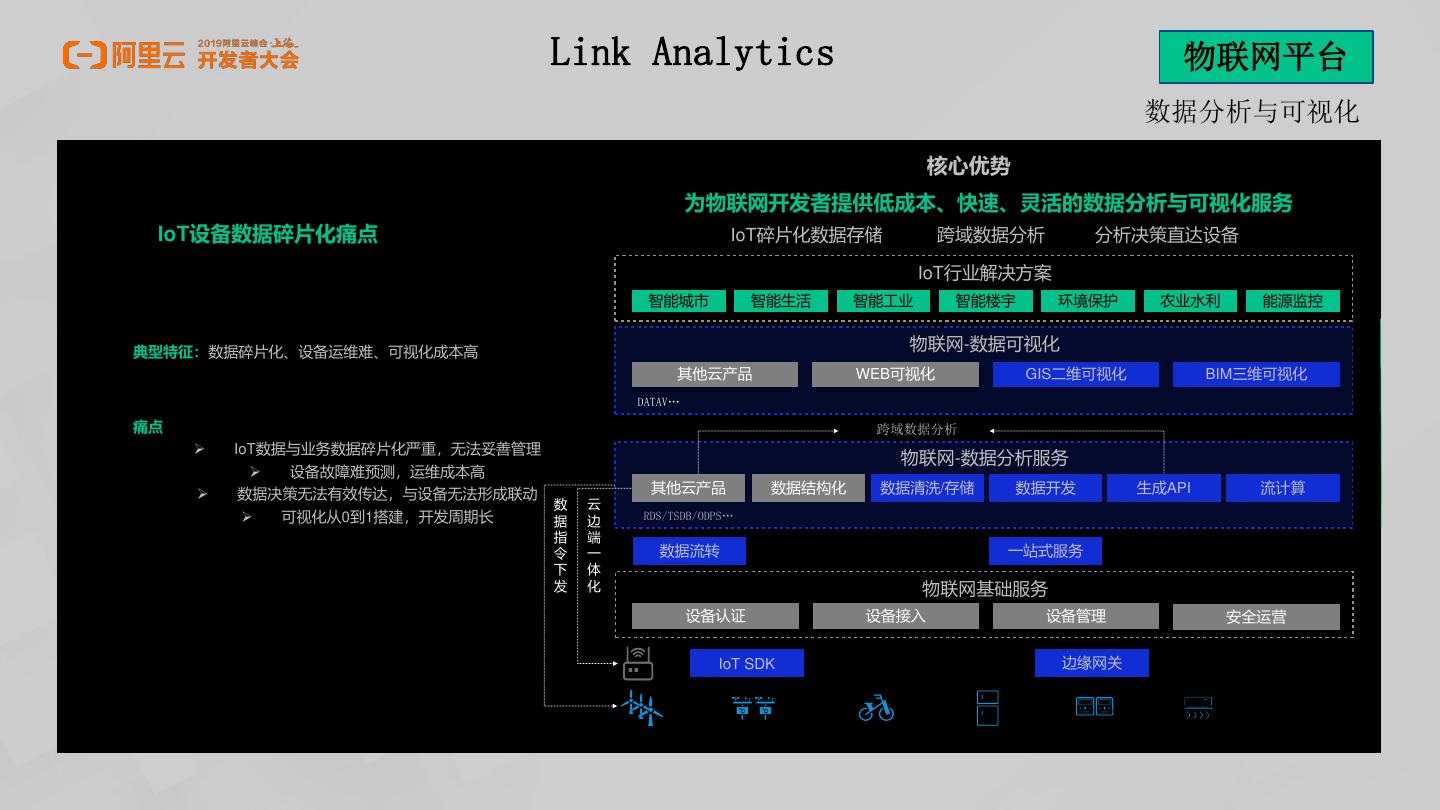 8 . Link Analytics 物联网平台 数据分析与可视化 核心优势 为物联网开发者提供低成本、快速、灵活的数据分析与可视化服务 IoT设备数据碎片化痛点 IoT碎片化数据存储 跨域数据分析 分析决策直达设备 IoT行业解决方案 智能城市 智能生活 智能工业 智能楼宇 环境保护 农业水利 能源监控 典型特征:数据碎片化、设备运维难、可视化成本高 物联网-数据可视化 其他云产品 WEB可视化 GIS二维可视化 BIM三维可视化 DATAV… 痛点 跨域数据分析 IoT数据与业务数据碎片化严重,无法妥善管理 物联网-数据分析服务 设备故障难预测,运维成本高 数据决策无法有效传达,与设备无法形成联动 其他云产品 数据结构化 数据清洗/存储 数据开发 生成API 流计算 数 云 可视化从0到1搭建,开发周期长 据 边 RDS/TSDB/ODPS… 指 端 令 一 数据流转 一站式服务 下 体 发 化 物联网基础服务 设备认证 设备接入 设备管理 安全运营 IoT SDK 边缘网关