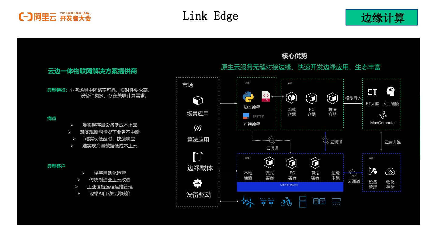 10 . Link Edge 边缘计算 核心优势 原生云服务无缝对接边缘、快速开发边缘应用、生态丰富 云边一体物联网解决方案提供商 市场 市场 云端 典型特征:业务场景中网络不可靠、实时性要求高、 设备种类多、存在关联计算需求。 模型导入 ET大脑 人工智能 脚本编程 流式 FC 算法 场景应用 容器 容器 容器 痛点 可视编程 MaxCompute 难实现存量设备低成本上云 难实现断网情况下业务不中断 难实现低延时、快速响应 算法应用 云通道 云端训练 难实现海量数据低成本上云 云通道 边缘 云端 典型客户 边缘载体 楼宇自动化运营 本地 流式 FC 算法 边缘 通道 容器 容器 容器 采集 传统制造业上云改造 云通道 设备 物化 工业设备远程运维管理 设备连接+设备控制 管理 存储 边缘AI自动检测缺陷 设备驱动