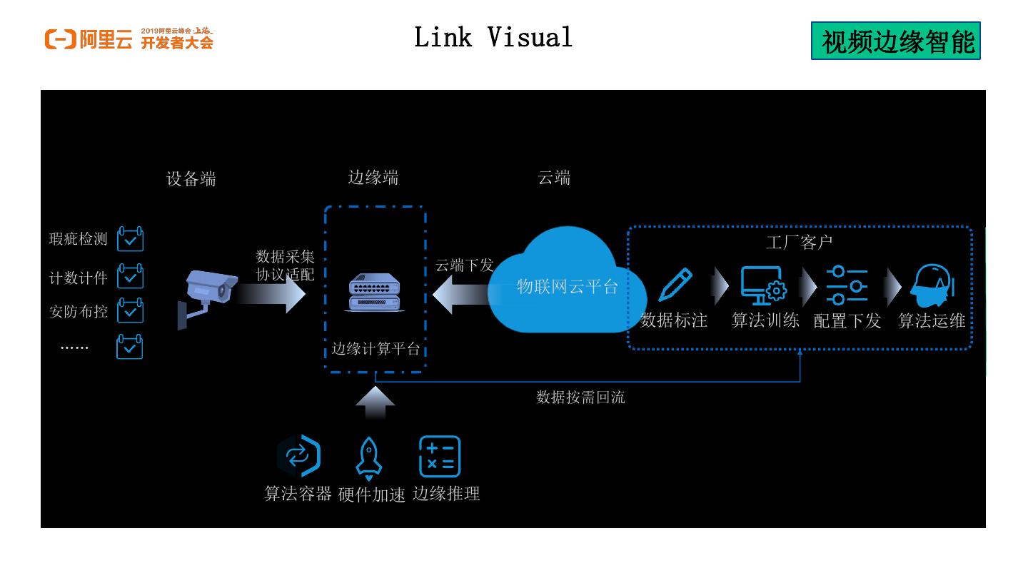 11 . Link Visual 视频边缘智能 设备端 边缘端 云端 瑕疵检测 工厂客户 数据采集 云端下发 计数计件 协议适配 物联网云平台 安防布控 数据标注 算法训练 配置下发 算法运维 …… 边缘计算平台 数据按需回流 算法容器 硬件加速 边缘推理