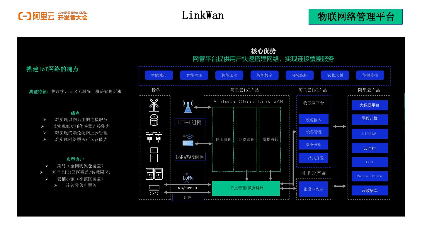 12 . LinkWan 物联网络管理平台 核心优势 网管平台提供用户快速搭建网络,实现连接覆盖服务 搭建IoT网络的痛点 智能城市 智能生活 智能工业 智能楼宇 环境保护 农业水利 能源监控 典型特征:物连接、盲区无服务、覆盖管理诉求 设备 阿里云IoT产品 阿里云IoT产品 阿里云产品 Alibaba Cloud Link WAN 物联网平台 大数据平台 痛点 难实现以物为主的连接服务 设备接入 函数计算 LTE-U组网 难实现低功耗传感器连接能力 难实现终端免配网上云管理 设备管理 HiTSDB 难实现网络覆盖可运营能力 网关管理 网络管理 数据流转 数据分析 云监控 典型客户 LoRaWAN组网 一站式开发 ECS 菜鸟(全国物流仓覆盖) 阿里巴巴(园区覆盖/智慧园区) 阿里云产品 Table Store 云栖小镇(小镇区覆盖) 连锁零售店覆盖 NB/LTE-U 节点管理&数据链路 消息队列MQ 云数据库 用网