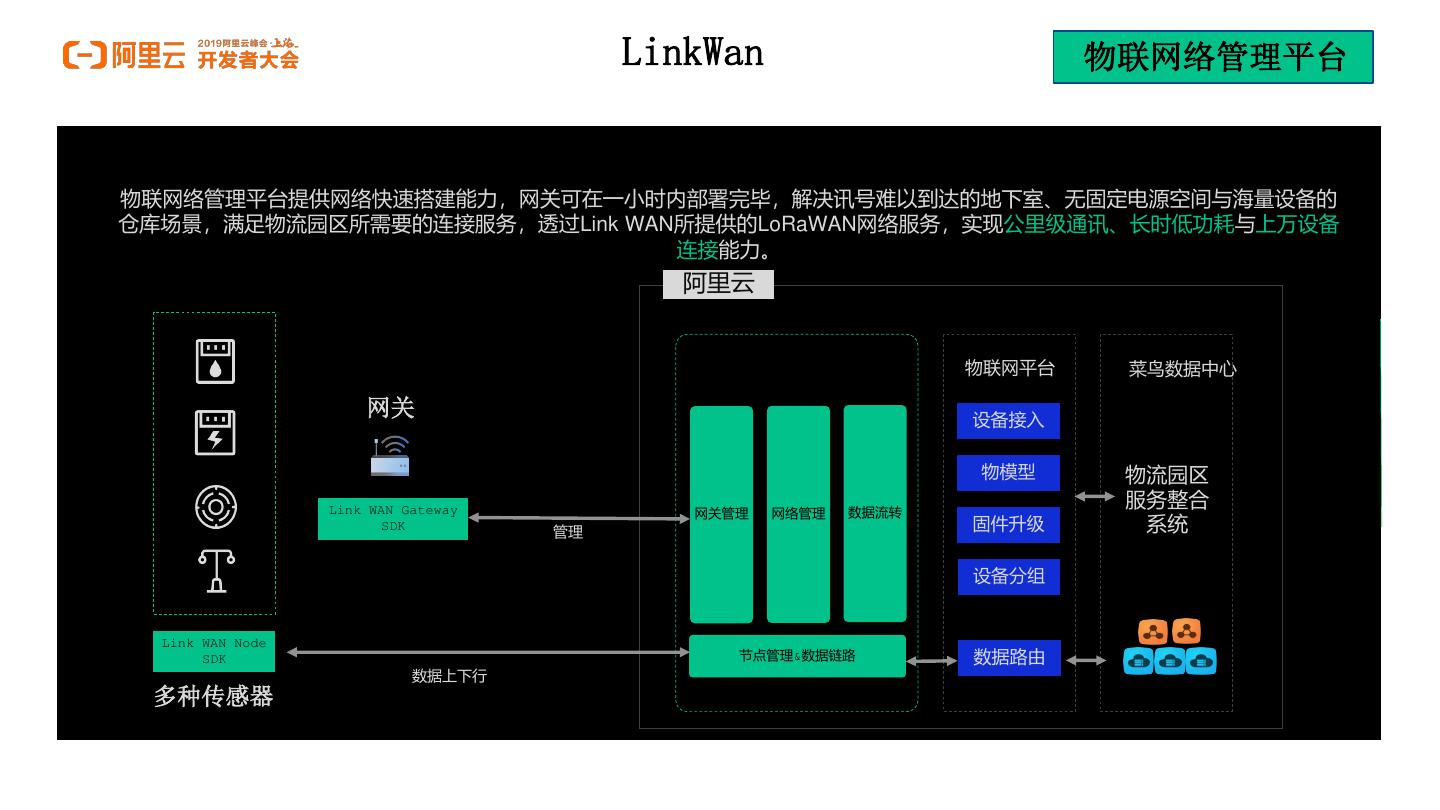 13 . LinkWan 物联网络管理平台 搭建园区网络(菜鸟物流仓) 物联网络管理平台提供网络快速搭建能力,网关可在一小时内部署完毕,解决讯号难以到达的地下室、无固定电源空间与海量设备的 仓库场景,满足物流园区所需要的连接服务,透过Link WAN所提供的LoRaWAN网络服务,实现公里级通讯、长时低功耗与上万设备 连接能力。 阿里云 园区场景 Link WAN 物联网平台 菜鸟数据中心 网关 设备接入 物模型 物流园区 Link WAN Gateway 服务整合 网关管理 网络管理 数据流转 SDK 管理 固件升级 系统 设备分组 Link WAN Node SDK 节点管理&数据链路 数据路由 数据上下行 多种传感器
