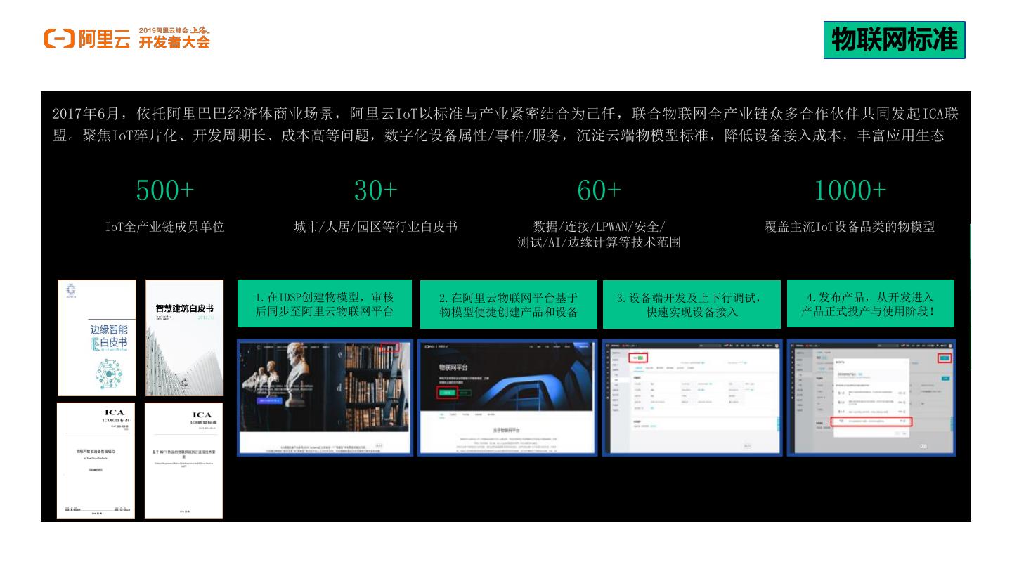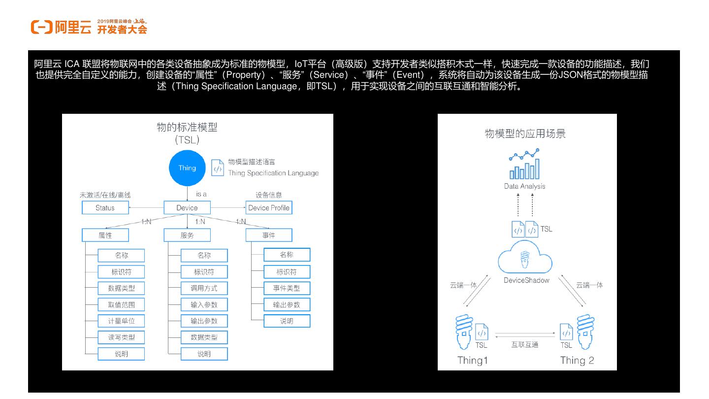 23 .阿里云 ICA 联盟将物联网中的各类设备抽象成为标准的物模型,IoT平台(高级版)支持开发者类似搭积木式一样,快速完成一款设备的功能描述,我们 也提供完全自定义的能力,创建设备的“属性”(Property)、“服务”(Service)、“事件”(Event),系统将自动为该设备生成一份JSON格式的物模型描 述(Thing Specification Language,即TSL),用于实现设备之间的互联互通和智能分析。