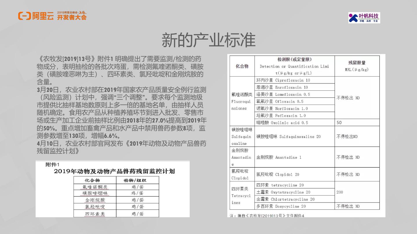 5 . 新的产业标准 《农牧发[2019]13号》附件1 明确提出了需要监测/检测的药 物成分,表明抽检的各批次鸡蛋,需检测氟喹诺酮类、磺胺 类(磺胺喹恶啉为主)、四环素类、氯羟吡啶和金刚烷胺的 含量。 3月20日,农业农村部在2019年国家农产品质量安全例行监测 (风险监测)计划中,强调“三个调整”。要求每个监测地级 市提供比抽样基地数原则上多一倍的基地名单,由抽样人员 随机确定。食用农产品从种植养殖环节到进入批发、零售市 场或生产加工企业前抽样比例由2018年的27.0%提高到2019年 的50%。重点增加畜禽产品和水产品中禁用兽药参数8项,监 测参数增至130项,增幅6.6%。 4月10日,农业农村部官网发布《2019年动物及动物产品兽药 残留监控计划》