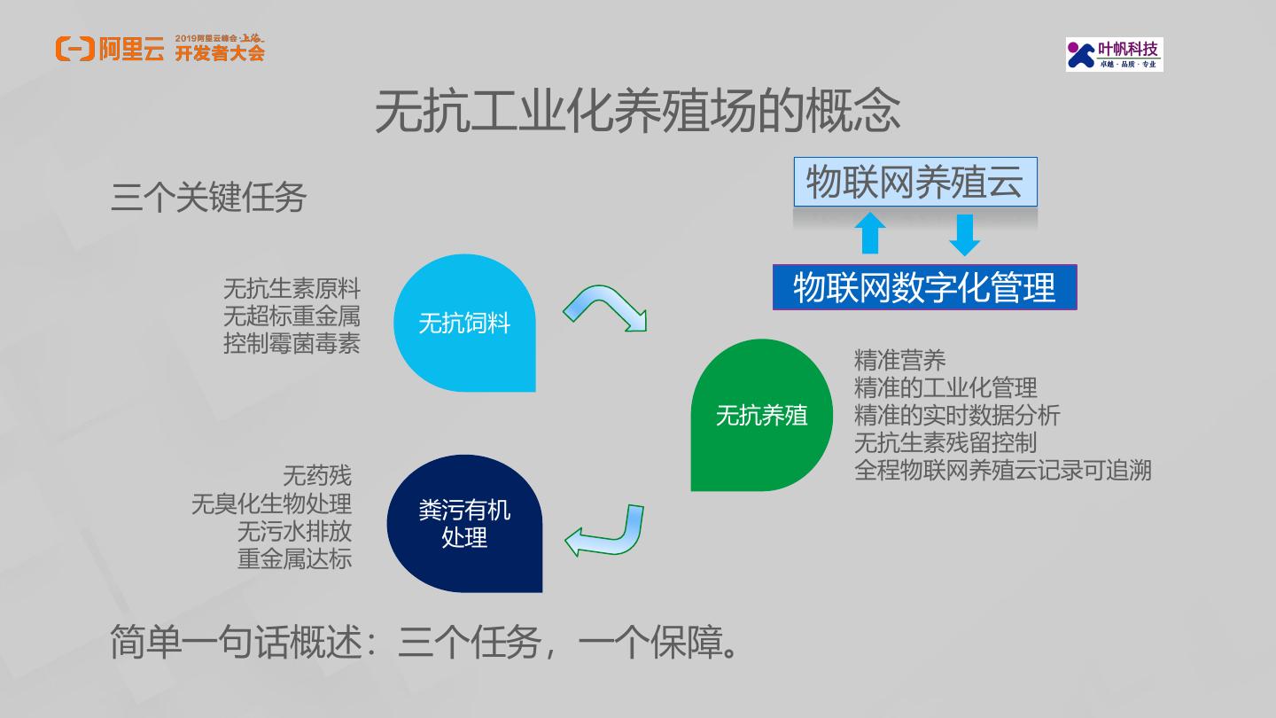 9 . 无抗工业化养殖场的概念 三个关键任务 物联网养殖云 无抗生素原料 物联网数字化管理 无超标重金属 无抗饲料 控制霉菌毒素 精准营养 精准的工业化管理 无抗养殖 精准的实时数据分析 无抗生素残留控制 无药残 全程物联网养殖云记录可追溯 无臭化生物处理 粪污有机 无污水排放 处理 重金属达标 简单一句话概述:三个任务,一个保障。