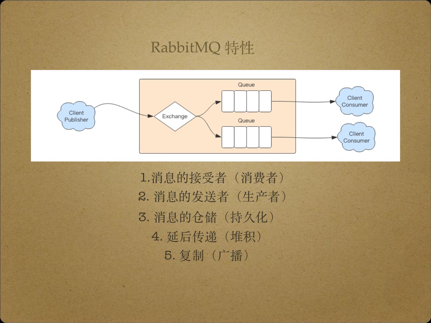 5 . RabbitMQ 特性 1.消息的接受者(消费者) 2. 消息的发送者(⽣产者) 3. 消息的仓储(持久化) 4. 延后传递(堆积)