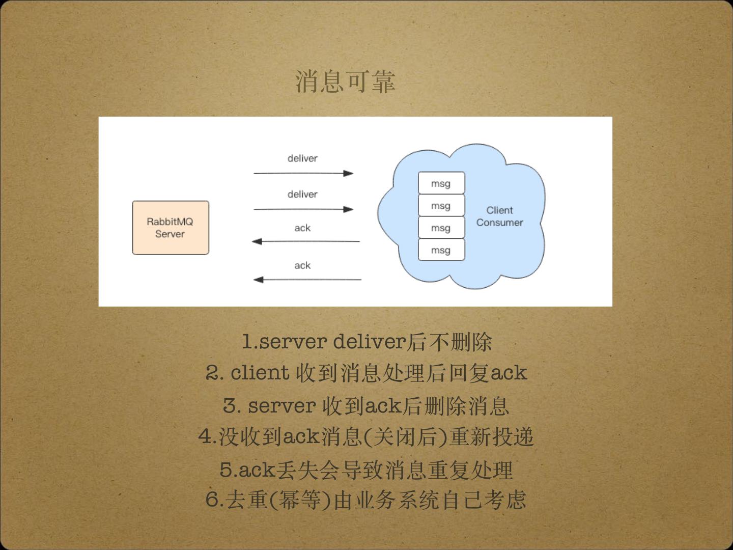 11 . 消息可靠 1.server deliver后不删除 2. client 收到消息处理后回复ack 3. server 收到ack后删除消息 4.没收到ack消息(关闭后)重新投递 5.ack丢失会导致消息重复处理 6.去重(幂等)由业务系统⾃⼰考虑