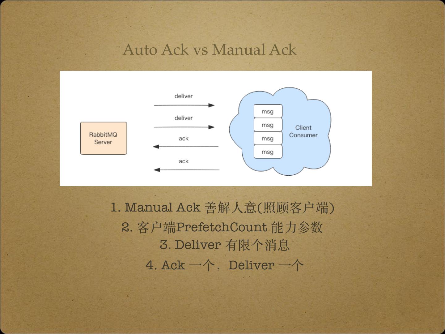 12 .Auto Ack vs Manual Ack 1.AutoAck 投后即删(no ack) 2. ⽹络故障,消息丢失 3.消费慢,投递风暴 4.缓冲区堆积,Server 写不动 5.链接被Server强制关闭