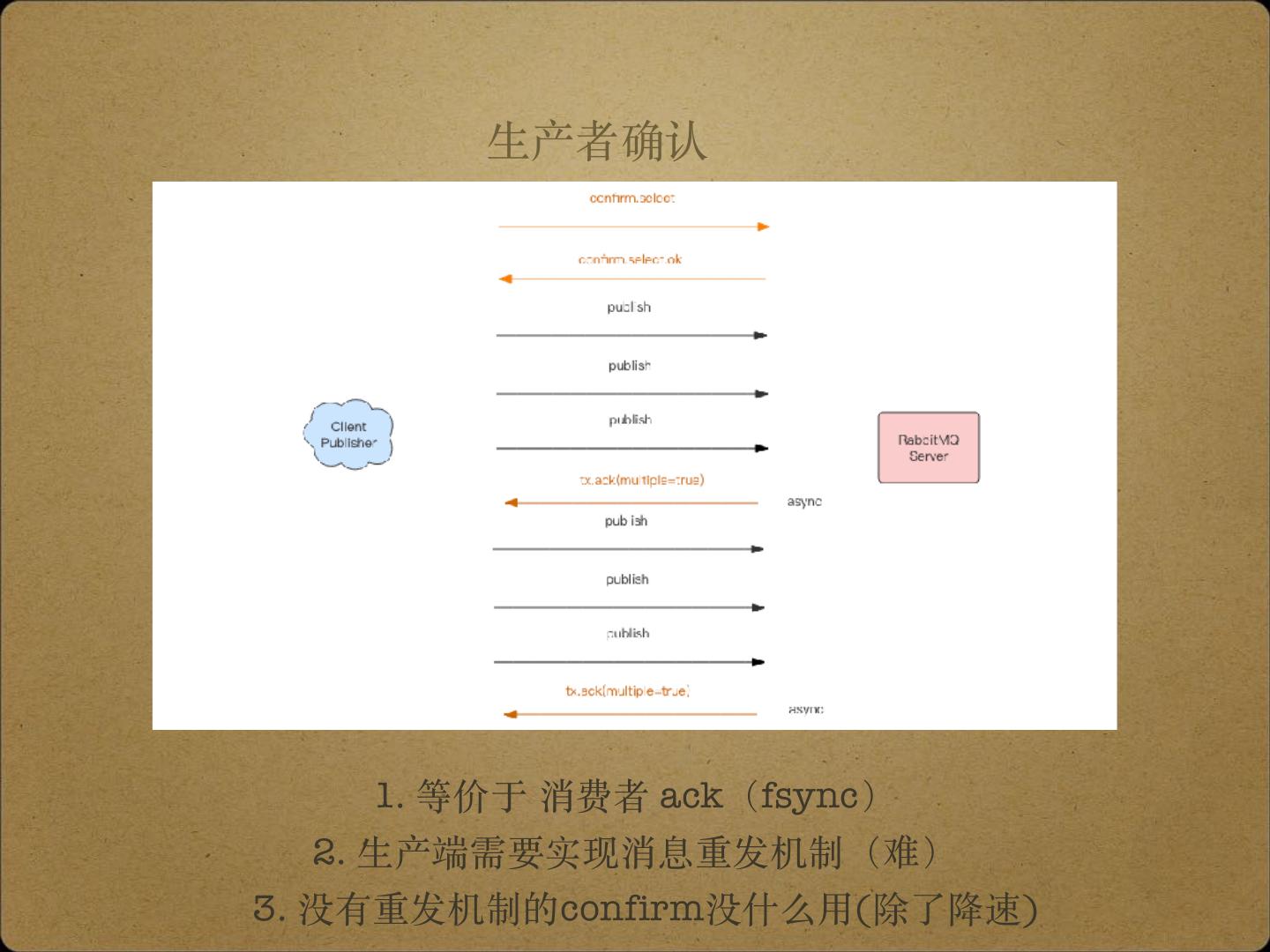 18 . ⽣产者确认 1. 等价于 消费者 ack(fsync) 2. ⽣产端需要实现消息重发机制(难) 3. 没有重发机制的confirm没什么⽤(除了降速)