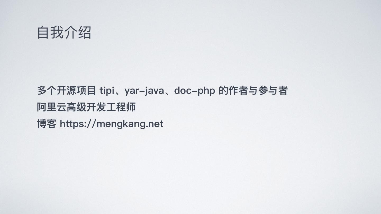 2 .⾃自我介绍 多个开源项⽬目 tipi、yar-java、doc-php 的作者与参与者 阿⾥里里云⾼高级开发⼯工程师 博客 https://mengkang.net