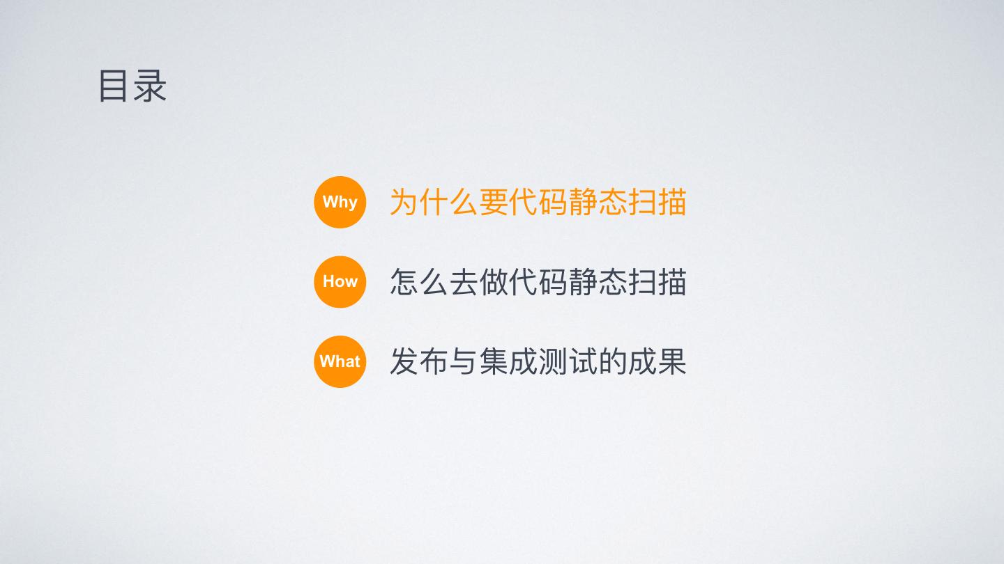 3 .⽬目录 Why 为什什么要代码静态扫描 How 怎么去做代码静态扫描 What 发布与集成测试的成果