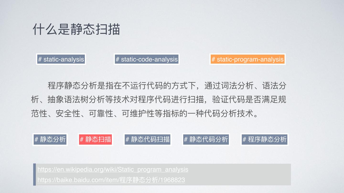 4 .什什么是静态扫描 # static-analysis # static-code-analysis # static-program-analysis 程序静态分析是指在不不运⾏行行代码的⽅方式下,通过词法分析、语法分 析、抽象语法树分析等技术对程序代码进⾏行行扫描,验证代码是否满⾜足规 范性、安全性、可靠性、可维护性等指标的⼀一种代码分析技术。 # 静态分析 # 静态扫描 # 静态代码扫描 # 静态代码分析 # 程序静态分析 https://en.wikipedia.org/wiki/Static_program_analysis https://baike.baidu.com/item/程序静态分析/1968823