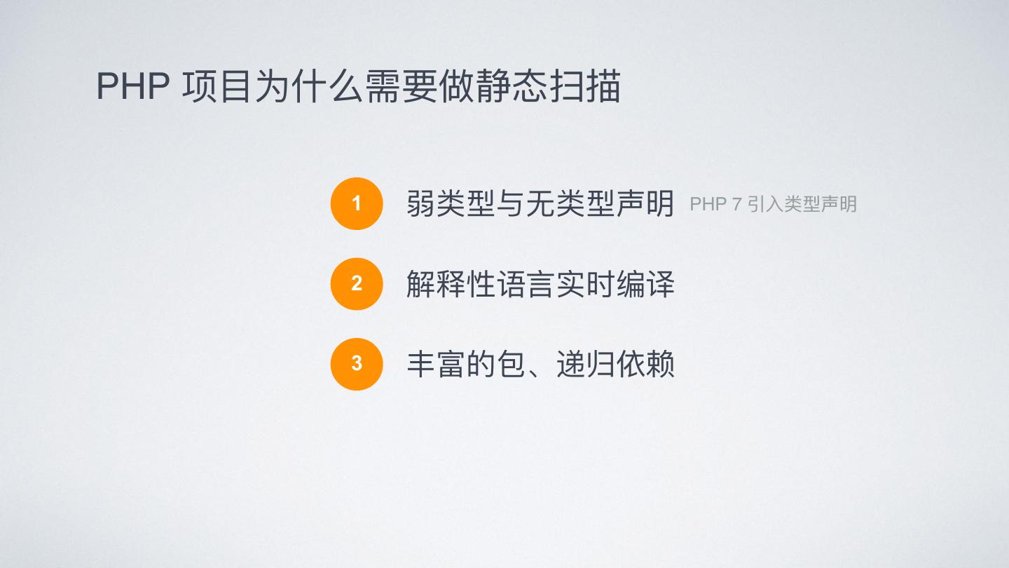 5 .PHP 项⽬目为什什么需要做静态扫描 1 弱类型与⽆无类型声明 PHP 7 引⼊入类型声明 2 解释性语⾔言实时编译 3 丰富的包、递归依赖