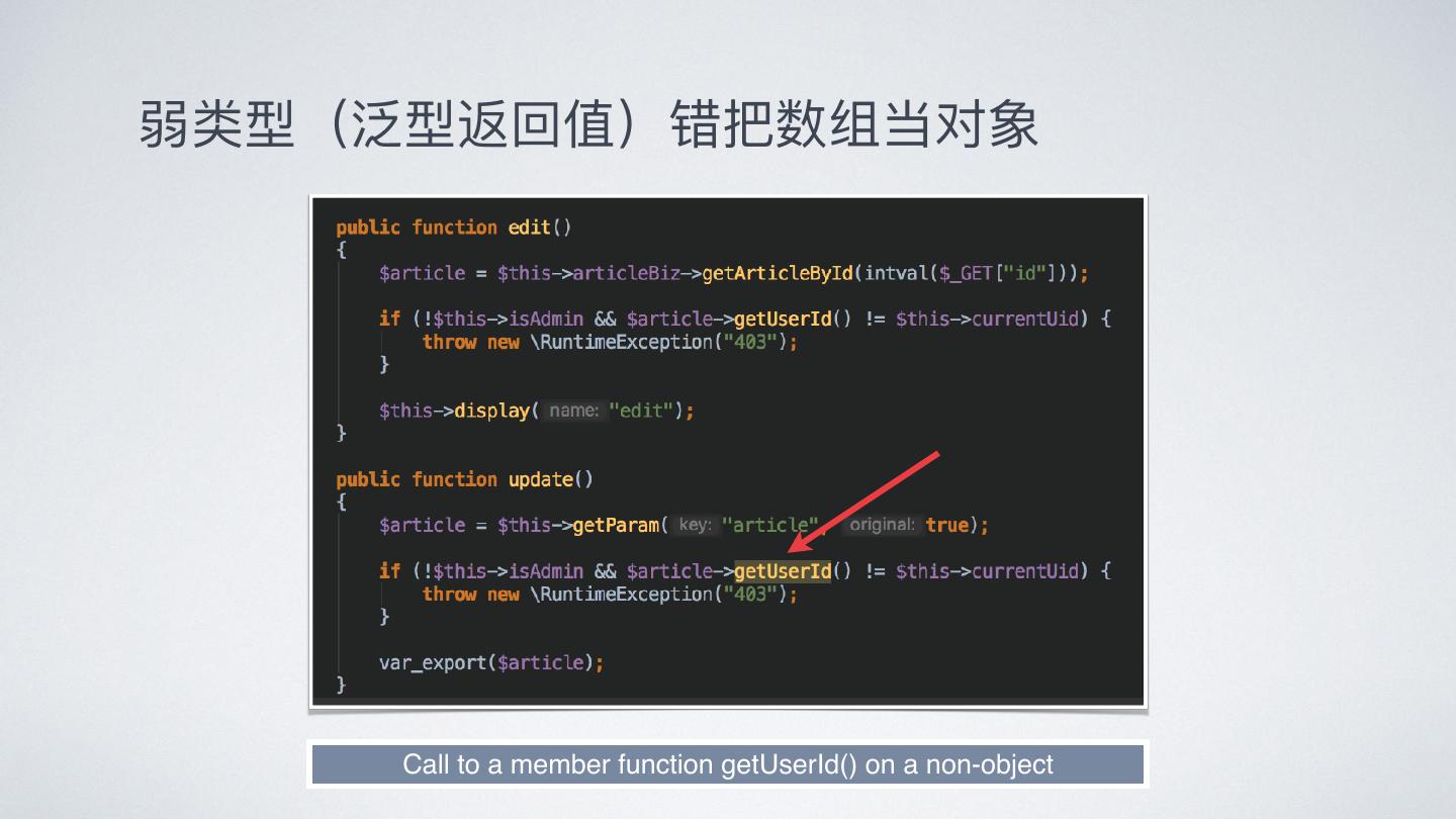 6 .弱类型(泛型返回值)错把数组当对象 Call to a member function getUserId() on a non-object