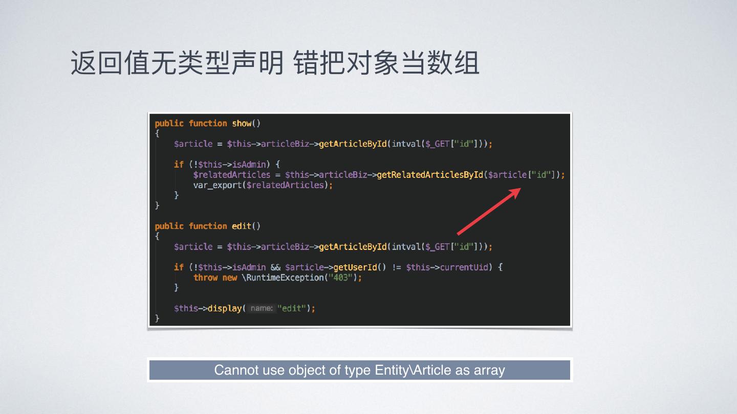 7 .返回值⽆无类型声明 错把对象当数组 Cannot use object of type Entity\Article as array