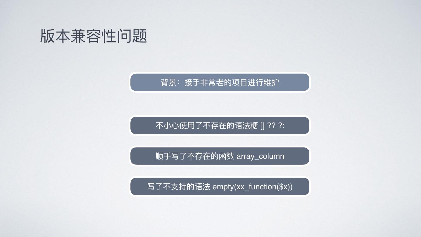 9 .版本兼容性问题 背景:接⼿手⾮非常⽼老老的项⽬目进⾏行行维护 不不⼩小⼼心使⽤用了了不不存在的语法糖 [] ?? ?: 顺⼿手写了了不不存在的函数 array_column 写了了不不⽀支持的语法 empty(xx_function($x))