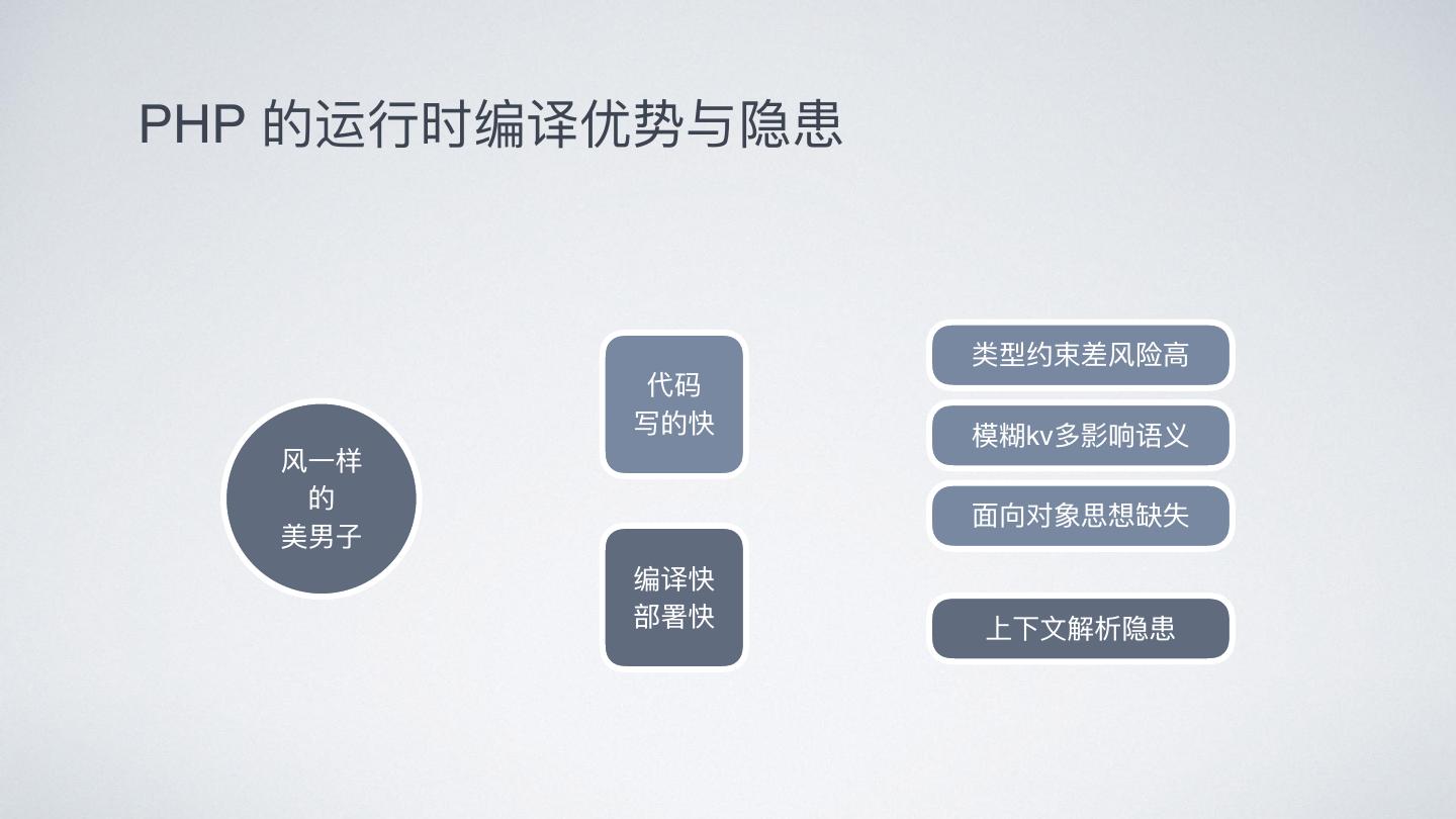 11 .PHP 的运⾏行行时编译优势与隐患 类型约束差⻛风险⾼高 代码 写的快 模糊kv多影响语义 ⻛风⼀一样 的 ⾯面向对象思想缺失 美男⼦子 编译快 部署快 上下⽂文解析隐患