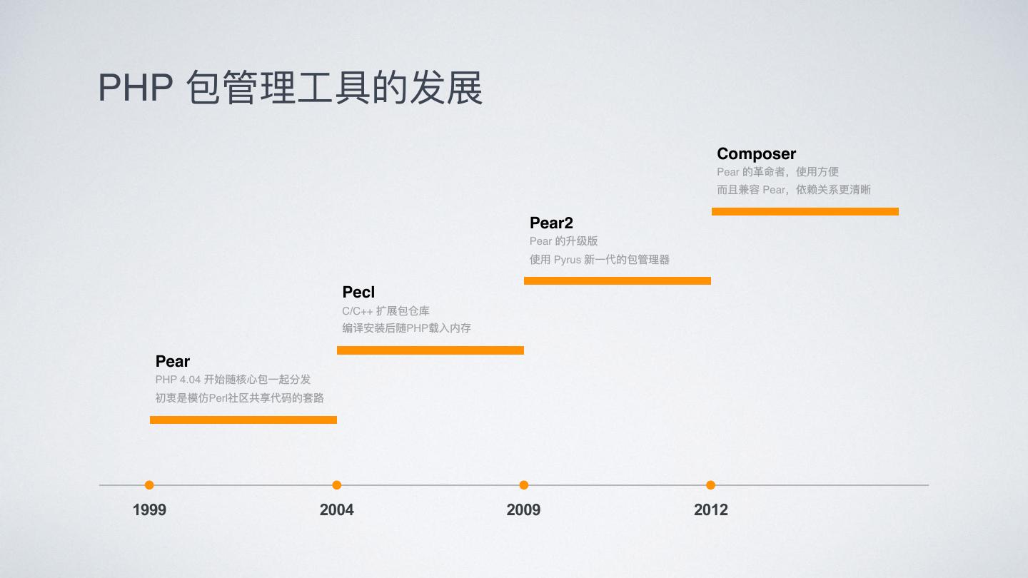 15 .PHP 包管理理⼯工具的发展 Composer Pear 的⾰革命者,使⽤用⽅方便便 ⽽而且兼容 Pear,依赖关系更更清晰 Pear2 Pear 的升级版 使⽤用 Pyrus 新⼀一代的包管理理器器 Pecl C/C++ 扩展包仓库 编译安装后随PHP载⼊入内存 Pear PHP 4.04 开始随核⼼心包⼀一起分发 初衷是模仿Perl社区共享代码的套路路 1999 2004 2009 2012
