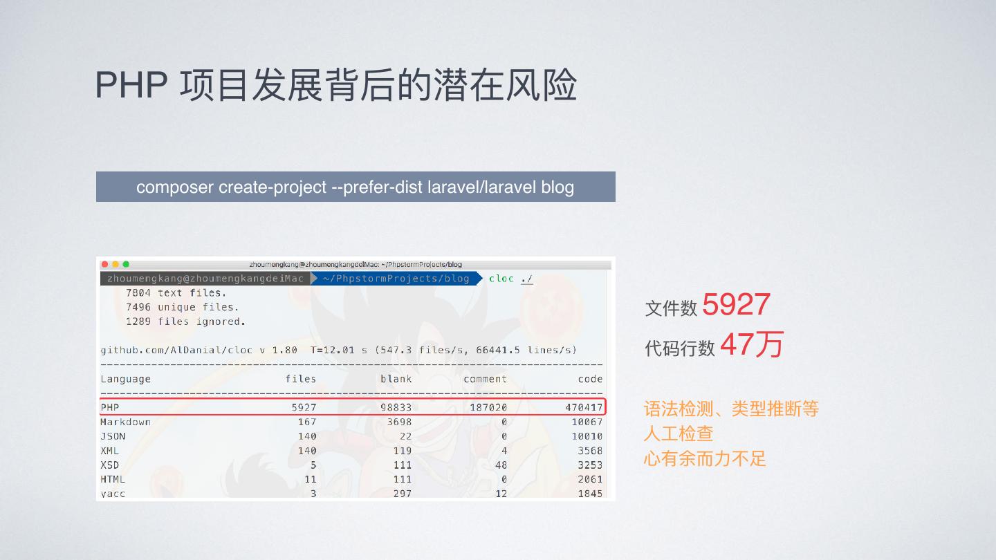 16 .PHP 项⽬目发展背后的潜在⻛风险 composer create-project --prefer-dist laravel/laravel blog ⽂文件数 5927 代码⾏行行数 47万 语法检测、类型推断等 ⼈人⼯工检查 ⼼心有余⽽而⼒力力不不⾜足