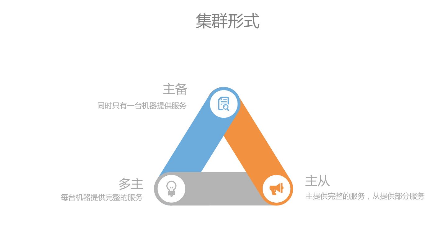 27 . 集群形式 主备 同时只有一台机器提供服务 多主 主从 每台机器提供完整的服务 主提供完整的服务,从提供部分服务