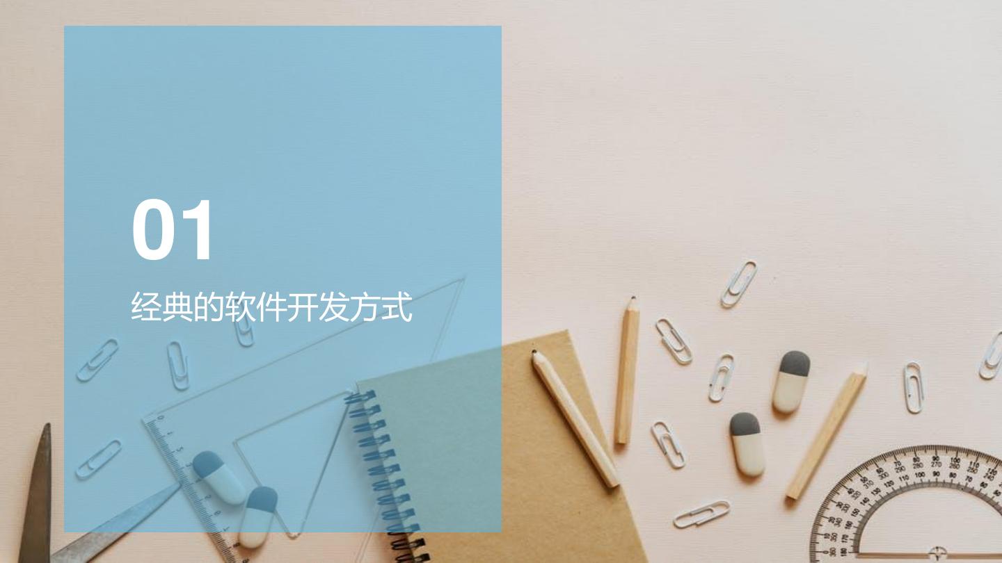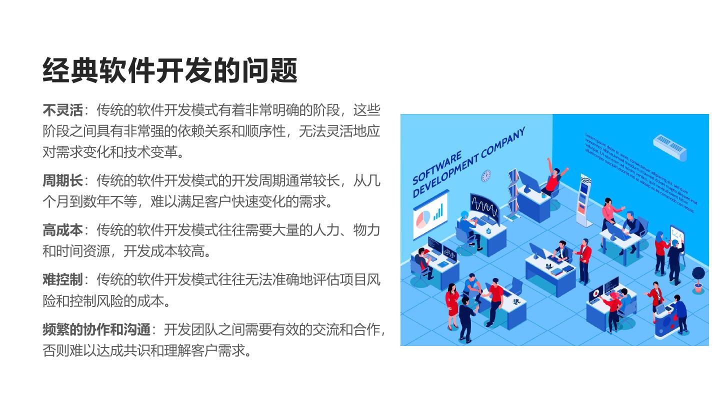 4 .经典软件开发的问题 不灵活:传统的软件开发模式有着非常明确的阶段,这些 阶段之间具有非常强的依赖关系和顺序性,无法灵活地应 对需求变化和技术变革。 周期长:传统的软件开发模式的开发周期通常较长,从几 个月到数年不等,难以满足客户快速变化的需求。 高成本:传统的软件开发模式往往需要大量的人力、物力 和时间资源,开发成本较高。 难控制:传统的软件开发模式往往无法准确地评估项目风 险和控制风险的成本。 频繁的协作和沟通:开发团队之间需要有效的交流和合作, 否则难以达成共识和理解客户需求。